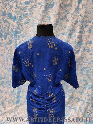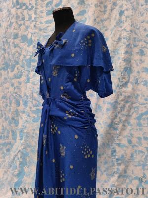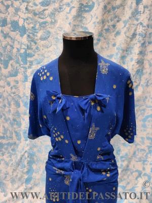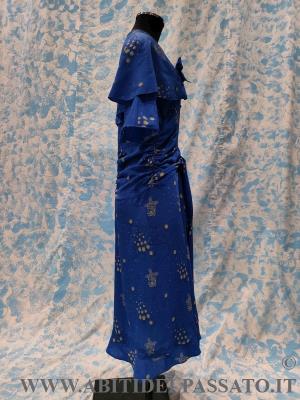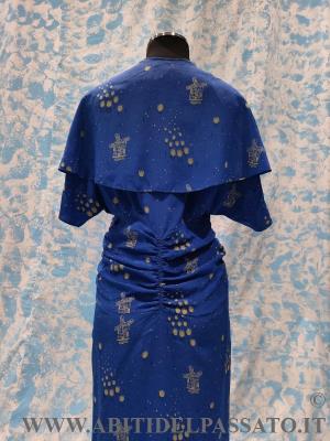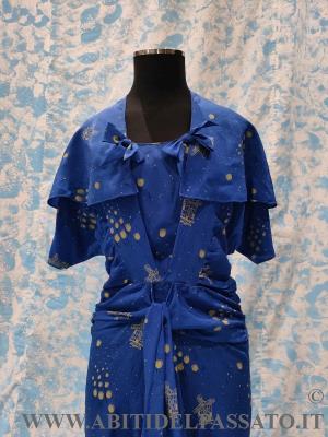 ABITO INTERO CON MANTELLINA STACCABILE, REALIZZATO IN CREPES DE CHINE, DI COLORE BLU ELETTRICO, STAMPATO A MOTIVI DI TULIPANI E MULINI A VENTO STILIZZATI
