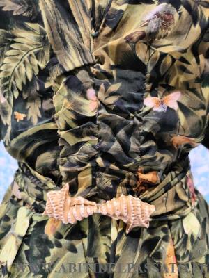 CINTURA REALIZZATA NELLO STESSO TESSUTO, SOSTENUTA NEL CENTRO DIETRO E NEI FIANCHI DA SERPENTINE METALLICHE, RIFINITA FRONTALEMENTE DA PARTICOLARE CHIUSURA DI CONCHIGLIE IN CELLULOIDE.