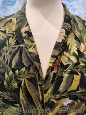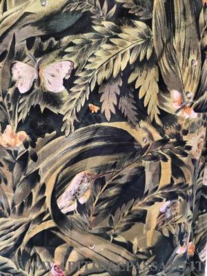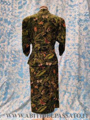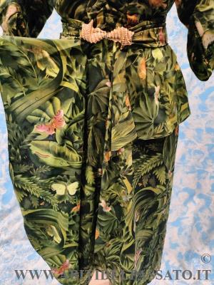 COMPLETO DA GIORNO COMPOSTO DA BITO INTERO E CINTURA, REALIZZATO IN CREPE DE CHINE, STAMPATA A SFONDO DI FOGLIE DI PIANTE VARIE, INSETTI, FARFALLE E UCCELLINI.