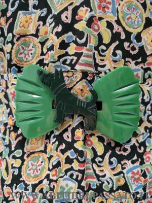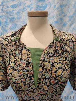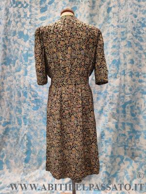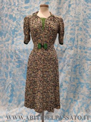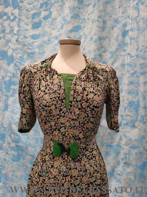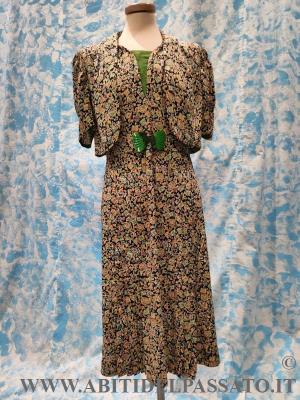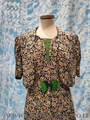 ABITO CORTO E TAGLIATO IN VITA, CON MANICA ARRICCIATA A PALLONCINO, APERTO DAVANTI MEDIANTE 4 AUTOMATICI IN PROSSIMITA' DEL TASSELLO VERDE, NON HA ALTRE APERTURE, IL TELO DEL DAVANTI DELLA GONNA, PRESENTA UN PLISSE' A PIEGA PIATTA, CON PIEGHE SPECCHIATE. PURTROPPO LA FANTASIA DEL TESSUTO, NON PERMETTE DI CAPIRE BENE I TAGLI E LE MOLTE LAVORAZIONI PRESENTI NELL'ABITO. SOPRABITO A MANICA TRE QUARTI, SI CHIUDE NEL CENTRO DAVANTI MEDIANTE 2 BOTTONI INTERNI, BOLERINO SENZA CHIUSURA E A COMPLETARE IL TUTTO, UNA CINTURA CON PARTICOLARE FIBBIA IN BACHELITE.