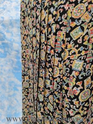 1935-40, MANIFATTURA ITALIANA, ABITO DA GIORNO COMPOSTO DA ABITO A MANICA CORTA, BOLERINO, SOPRABITO A MANICA A TRE QUARTI E CINTURA, REALIZZATO IN CREPES GEROGETTE DI SETA STAMPATA, RIPRENDE QUASI I DIESGNI DEL FOLCLORE SICILIANO.