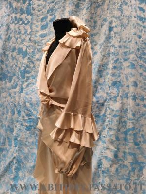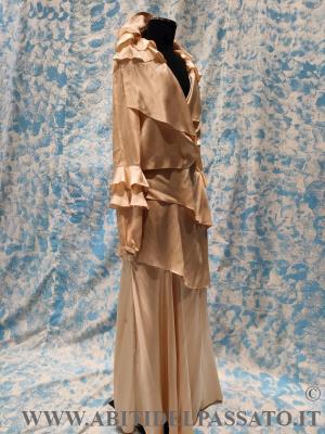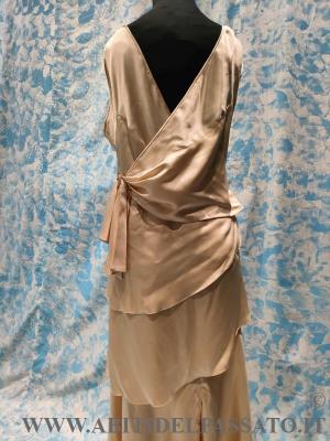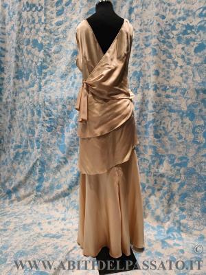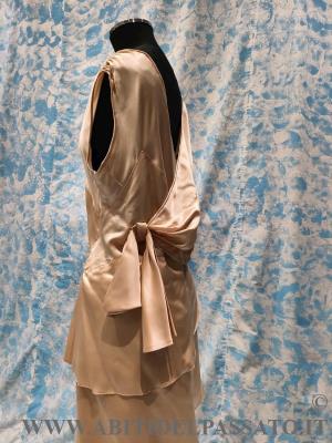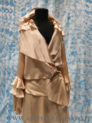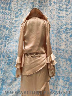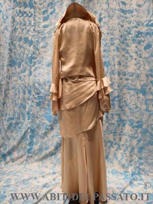 ABITO DA SERA REALIZZATO IN SATINE DI COLORE BURRO, COMPOSTO DA ABITO SENZA MANICHE E GIACCA CAMICIA.