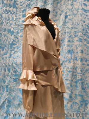 ABITO ASIMMETRICO, MOLTO DRAPPEGGIATO, CON PROFONDA SCOLLATURA. SI AGGANCIA TRAMITE 6 GANCI, TRA PUNTO VITA E FIANCO DAVANTI E SI CHIUDE, NELLA PARTE POSTERIORE CON ALTRI 3 GANCI POSIZIONATI NEL FIOCCO CHE SI APPOGGIA AL FIANCO SINISTRO. GONNA COSTRUITA CON VOLANT SBIECHI E ASIMMETRICI.