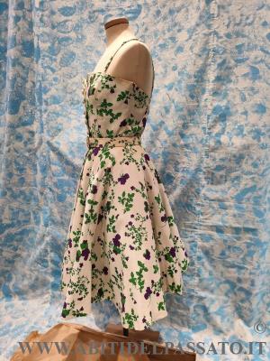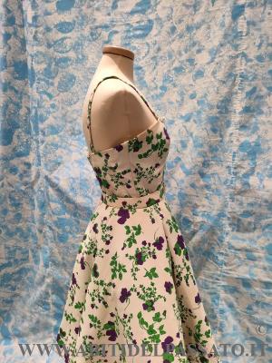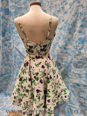 REALIZZATO IN PIQUET DI COTONE STAMPATO A MOTIVI FLOREALI NEI TONI DEL VIOLA E VERDE SU FONDO BIANCO.