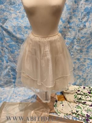 L'ABITO PRESENTA IL CORPINO STECCATO ED E' CHIUSO FRONTALMENTE DA BOTTONI E GANCI, GONNA A RUOTA INTERA FODERATA DI CELLULOSA. IL BOLERINO SI ANCORA ALL'ABITO MEDIANTE GANCI E OCCHIELLI IN FILO, SOTTOGONNA SEPARATA, REALIZZATA IN CRINOLINA E SI CHIUDE CON GANCI. CINURA SAGOMATA, REALIZZATA NELLO STESSO TESSUTO E RINFORZATA DA UNO STRATO DI TELA, CARTONE E RIFINITA CON PELLE DI CAPRETTO SOTTILISSIMO.