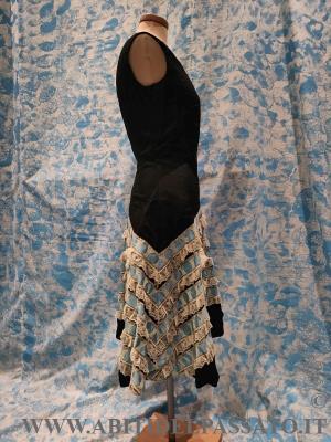 DI LINEA MOLTO ADERENTE SUL CORPINO, GONNA SVASATA A COROLLA, E' ARRICCHITA DA BORDI DI PIZZO DI COLOR AVORIO E NASTRI DI RASO DI COLORE AZZURRO. COMPLETAMENTE FODERATO IN TELA DI COTONE DI COLORE ROSSO VIVO. CHIUSURA SU FIANCO MEDIATE ZIP. ANDAVA INDOSSATO CON UNA SOTTOGONNA.