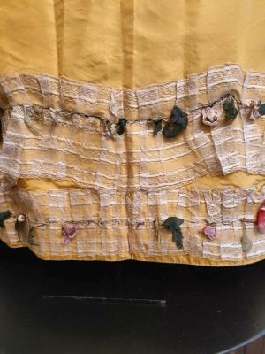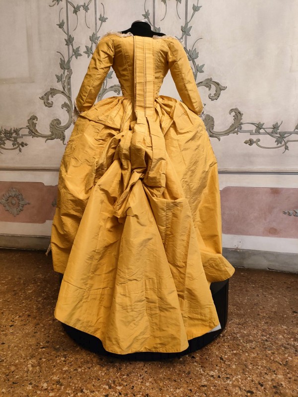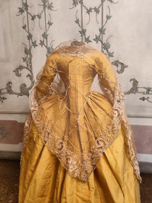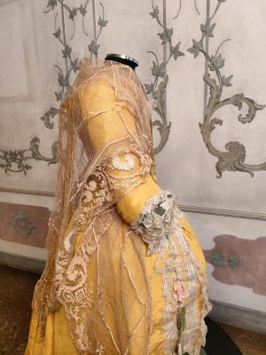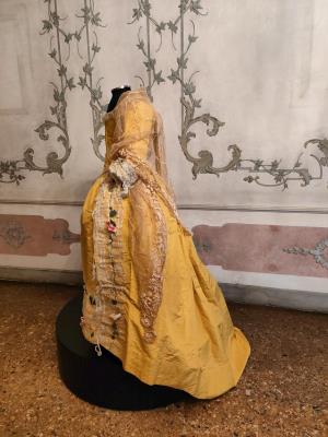 1775: ABITO DICHIARATO DA SPOSA, COMPOSTO DA CORPINO CON SOPRAGONNA STRASCICO E SOTTANINO, VELO O SCIALLE IN MODANO. L'ABITO E' REALIZZATO IN TAFFETA DI SETA DI COLORE GIALLO ORO, RICAMATO CON FIORI IN SETA RINFORZATI DA UN'ANIMA METALLICA E DA BANDE DI SETA SOTTILISSIMA. IL CORPINO SI CHIUDE FRONTALMENTE MEDIANTE STRINGATURA NASCOSTA DA UNA BANDA DI TESSUTO. IL CORPINO E' RINFORZATO DA STECCHE DI BALENA.L'ABITO E' IN CONDIZIONI ECCEZZIONALI.