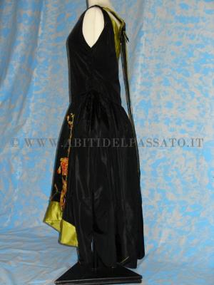 1924: ABITO DA SERA INTERO, REALIZZATO IN SETA DI COLORE NERO E VERDE MELA, CON RICAMI FLOREALI NEI TONI SFUMATI DELL'ARANCIO. PARTICOLARE DELL'ABITO, SONO I 2 PANIER, POSTI SOTTO IL PUNTO VITA, NEI FIANCHI.