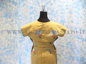 1948:ETICHETTA: "BASEGGIO" PARTICOLARE COMPLETO DA GIORNO COMPOSTO DA ABITO SENZA MANICHE, GIACCA E CINTURA, REALIZZATO IN OTTOMANN DI COTONE STAMPATO. GIACCA LUNGA SUL DAVANTI, CORTA SUL DIETRO E ABITO CHIUSI NELLA PARTE POSTERIORE MEDIANTE BOTTONI RICOPERTI DELLO STESSO TESSUTO. CONDIZIONI OTTIME.