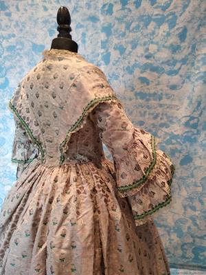 1850 CIRCA, MANIFATTUA ITALIANA, PROVENIENZA ITALIA MERIDIONALE PER QUESTO ABITO INTERO DI ECCEZZIONALE MANIFATTURA, COMPLETAMENTE CUCITO A MANO E REALIZZATO IN SETA OPERATA, ARRICCHITA DA PASSAMANERIA E MERLETTI AD AGO.