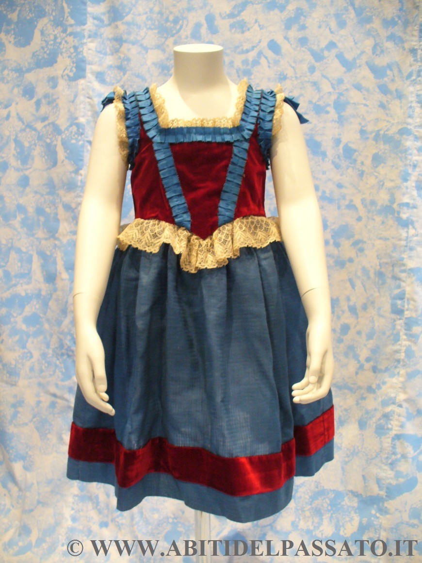 ABITO DA BAMBINA INTERO REALIZZATO IN TELA DI LANA E VELLUTO DI SETA. ARRICCHITO DA NASTRI DI SETA E PIZZO.