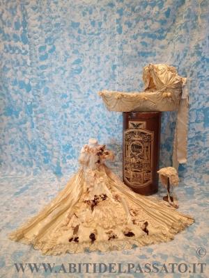 1875-1880: MANIFATTURA ITALIANA, PROVENIENZA MILANO PER QUESTO ABITO DA BATTESIMO REALIZZATO IN RASO E CHIFFON DI SETA COLOR AVORIO E COMPLETO DI CUFFIETTA.