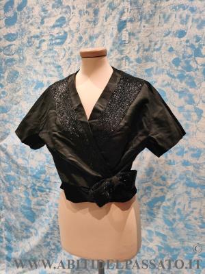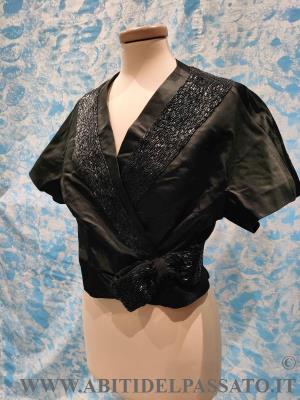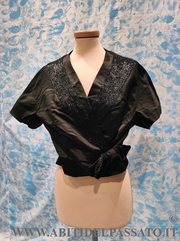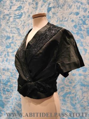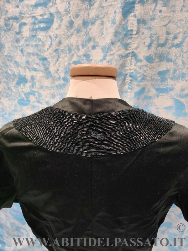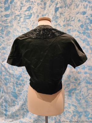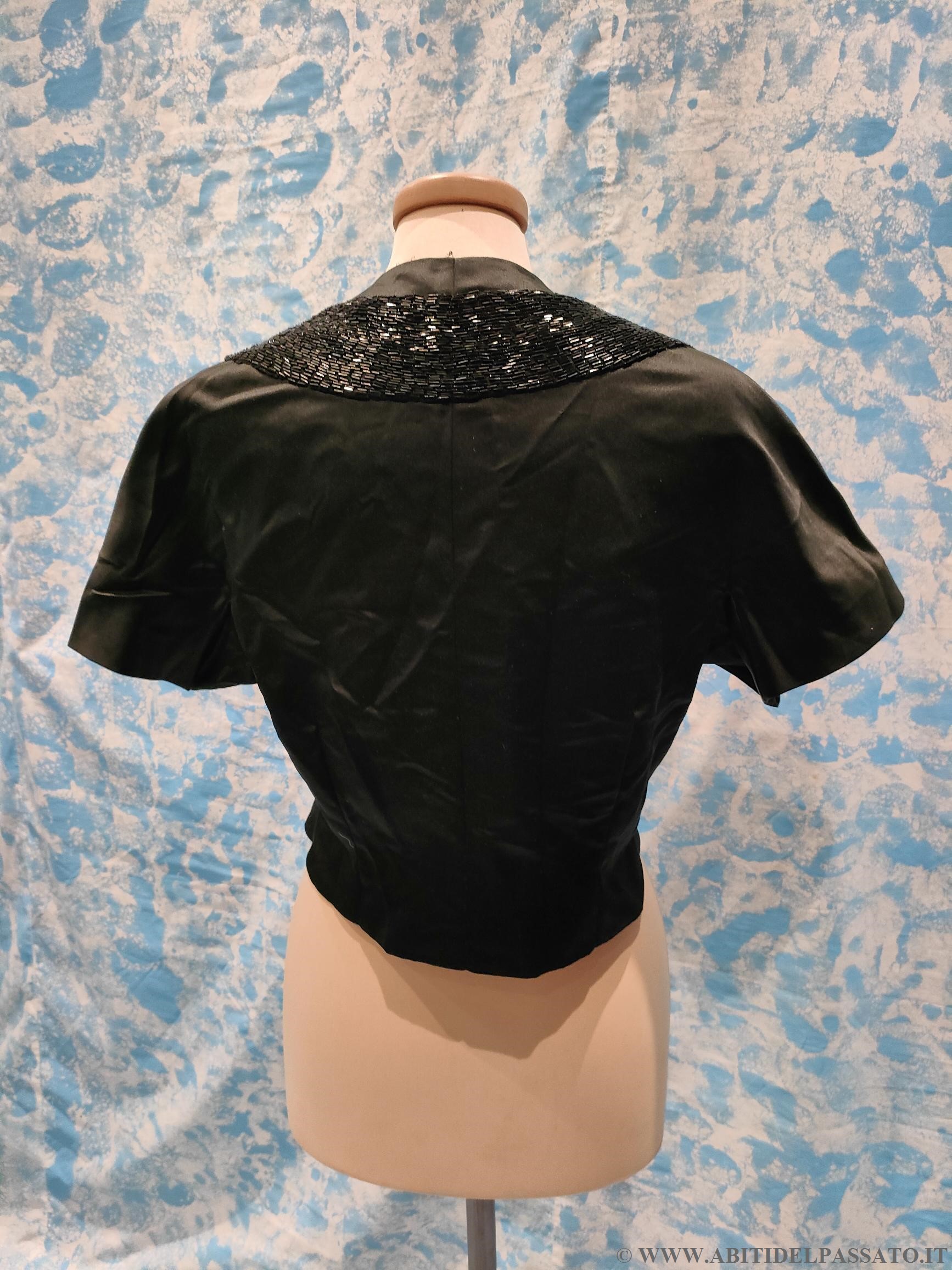 1950-55: MANIFATTURA ITALIANA, BOLERINO COPRI ABITO DA SERA, REALIZZATO IN DOUCHESSE DI SETA DI COLORE NERO, IMPREZIOSITO DA RICAMI IN TUBETTI DI VETRO. CHIUSURA FRONTALE, MEDIANTE GANCI E AUTOMATICI. PARTICOLARE TAGLIO DI MANICA A KIMONO CON TASSELLO E DRAPPEGGIO SUL CENTRO DAVANTI.