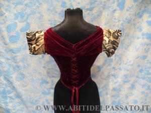1884 CIRCA: MANIFATTURA FRANCESE, CORPINO DA BALLO REALIZZATO IN VELLUTO DI SETA DI COLORE ROSSO CILIEGIA E SETA STAMPATA. CONDIZIONI MOLTO BUONE.