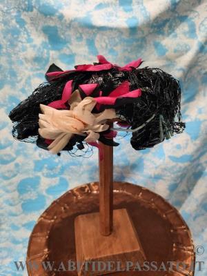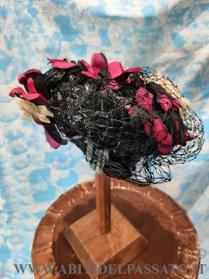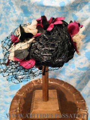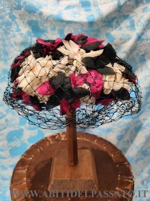 ELEGANTE CAPPELLO REALIZZATO DA TELAIO METALLICO, RICOPERTO DA GRANDI FIORI IN SETA, FIOCCO POSTERIORE IN RAFFIA INTECCIATA E ARRICCHITO DA VELETTA IN TULLE.