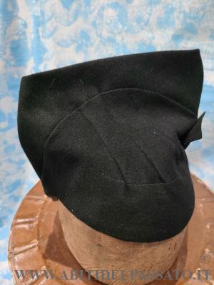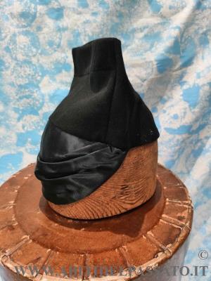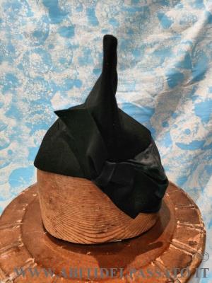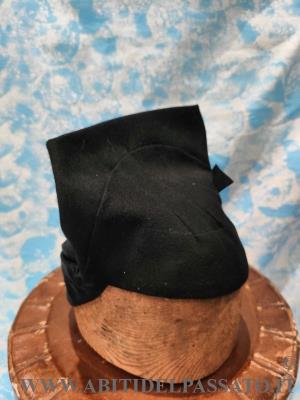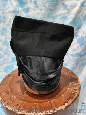 AUSTERO CAPPELLO FEMMINILE DA GIORNO, SECONDO LA MODA DEL TEMPO, REALIZZATO IN PANNO DI LANA E RASO DI SETA DI COLORE NERO.