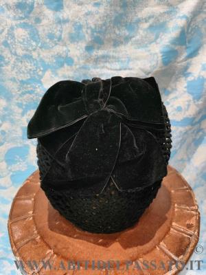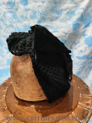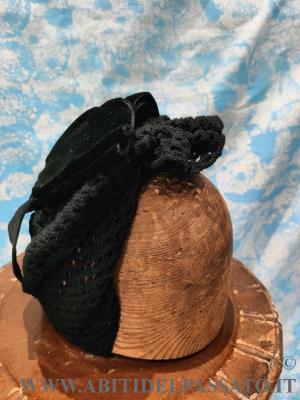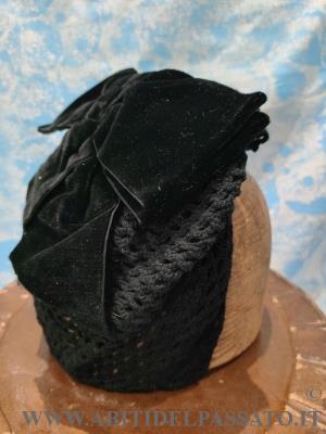 CAPPELLO, REALIZATO IN LANA ALL'UNCINETTO, DECORATO DA GRANDE FIOCCO IN VELLUTO DI COTONE, IL COPRICAPO E' STATO REALIZZATO COME RICHIEDEVA LA MODA DEL TEMPO, A MO DI TURBANTE, SI CALZA COME FOSSE UNA CUFFIA.