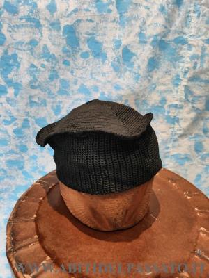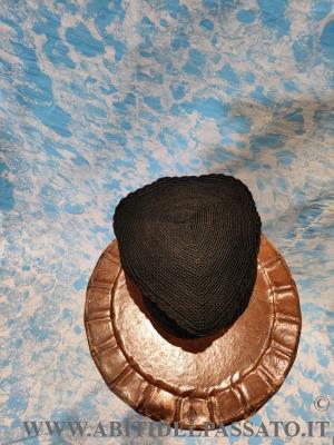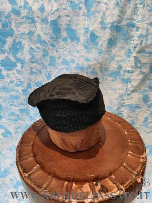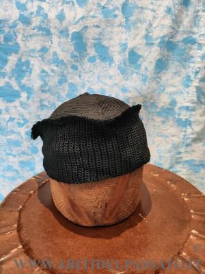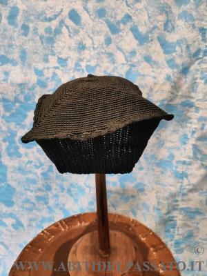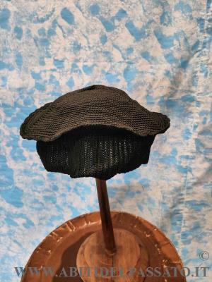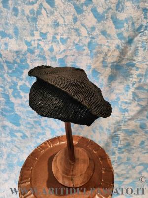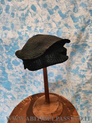 RARO E PARTICOLARE CAPPELLINO REALIZZATO A FERRI ED UNCINTETTO, IN FILATO DI SETA DI COLORE NERO. UNO DEI PRIMI CAPELLI REALIZZATI DALLA MAISON FRANCESE. L'ETICHETTA RISULTA ESSERE RICAMATA.
