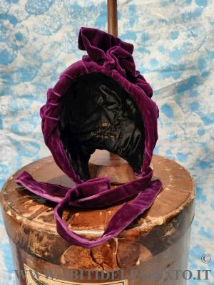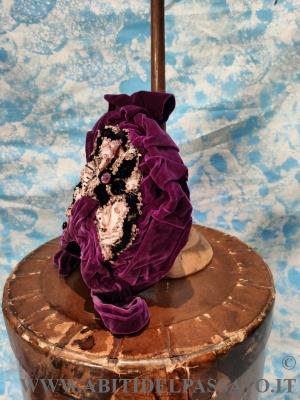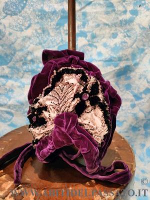DELIZIOSO CAPPELLINO A CUFFIA, REALIZZATO IN VELLUTO DI SETA VIOLA, RASO DI SETA ROSA, NASTRI DI VELLUTO NERO E RICAMATO DA COUVETTES IN TONO, PIETRE VITREE DI VARIE DIMENSIONI.