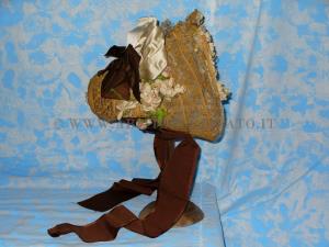 1836:CAPPELLO REALIZZATO DA STRISCE DI PAGLIA INTRECCIATA E DECORATO DA LARGHI NASTRI E FIORI DI SETA. INTERNO FODERATO IN TULLE E SETA.
