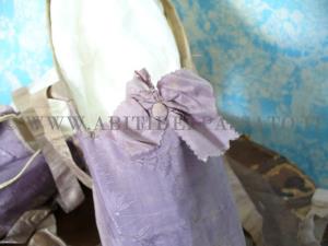 1810-1820: PAIO DI SCARPETTE REALIZZARE IN SETA OPERATA DI COLOR LILLA. ARRICCHITE DA FIOCCHI E BOTTONE RICOPERTO IN SETA IN TINTA. CONDIZIONI MOLTO BUONE.
