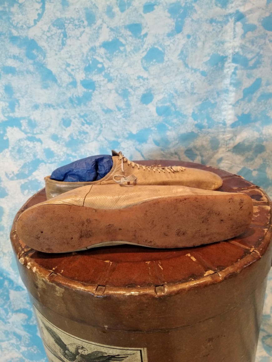 1835: SCARPETTE FEMMINILI STRINGATE, REALIZZATE IN PELLE DI CAPRETTO COLOR NOCCIOLA. LACCI IN SETA. CONDIZIONI ECCELLENTI.