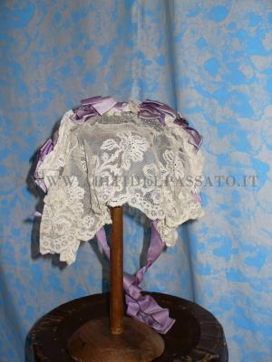 1865: CUFFIA DA GIORNO REALIZZATA IN MERLETTO MECCANICO E DECORATA CON NASTRI DI RASO.
