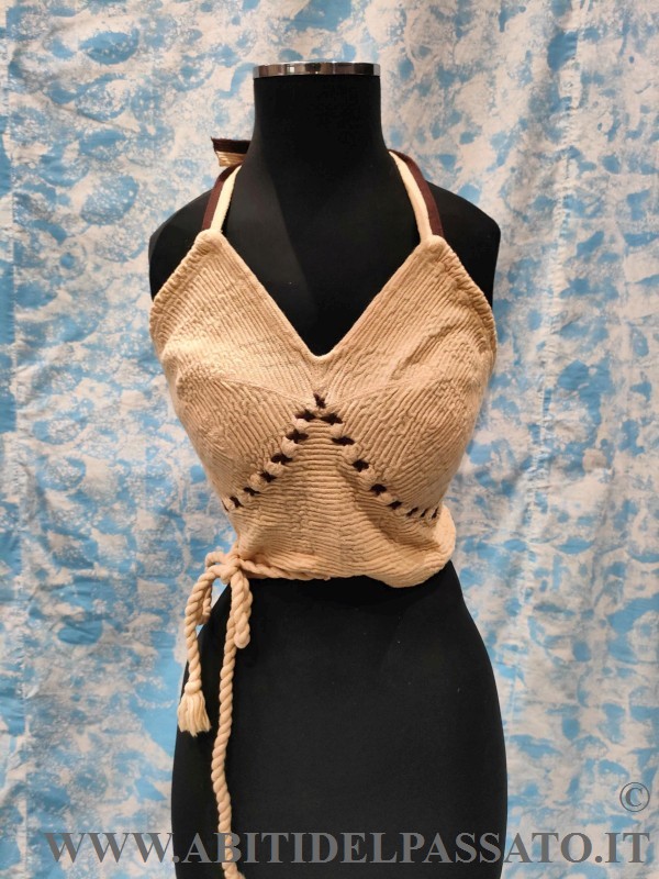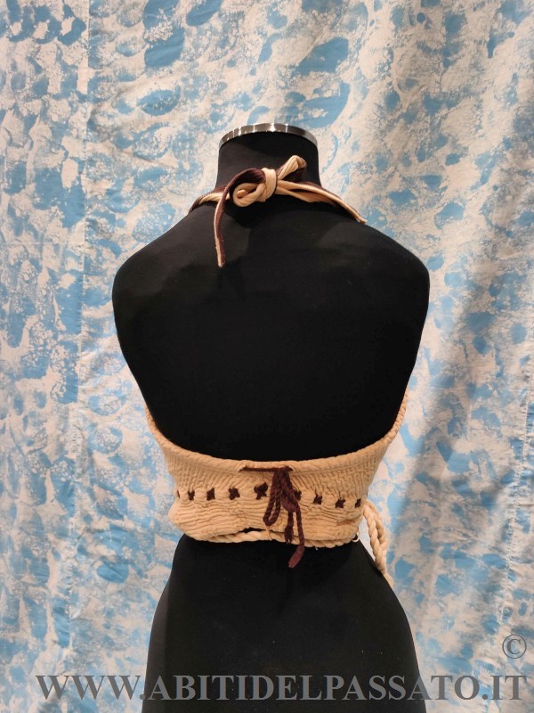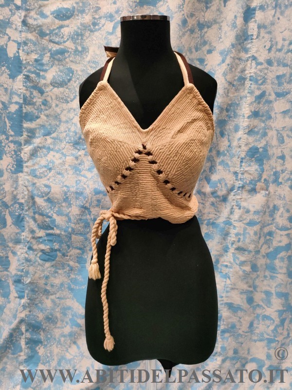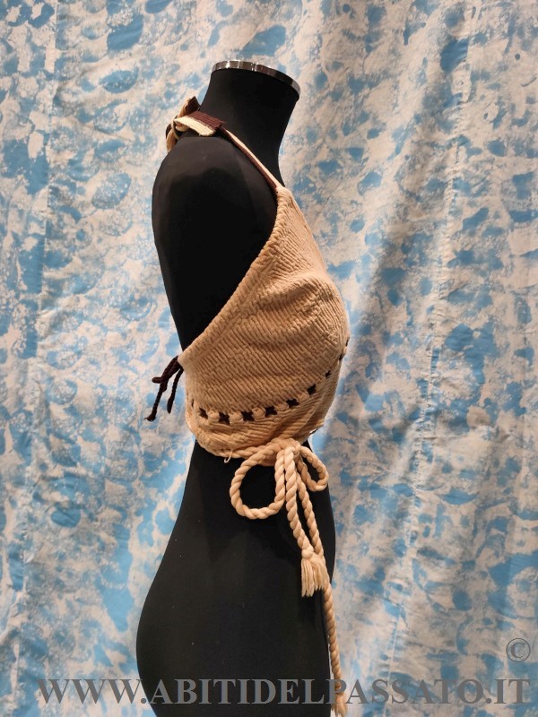 COSTUME DA BAGNO REALIZZATO IN PURA LANA, DI COLORE NOCCIOLA E CIOCCOLATO. PRIVO DI APERTURE, SI INFILA COME UNA MAGLIETTA, SI ANNODA DIETRO AL COLLO E IL CORDONE IN VITA PERMETTE DI REGOLARE LA CORRETTA MISURA.