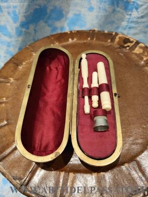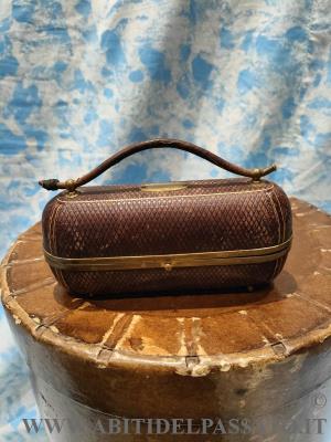 1870-1880, MANIFATTURA ITALIANA, BORSETTA DA VIAGGIO, CONTENENTE KIT DA LAVORO AD AGO, ED ESATTAMENTE, DITALE IN METALLO ARGENTATO, PORTA AGHI, PORTA SPILLI E BASE PER UNCINETTO, REALIZZATI IN AVORIO. COFANETTO ESTERNO REALIZZATO IN PELLE MARTELLATA. LA BORSETTA E' DI VISA IN DUE SCOMPARTI E FODERATA INTERNAMENTE DI RASO DI SETA ROSSO.