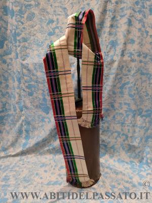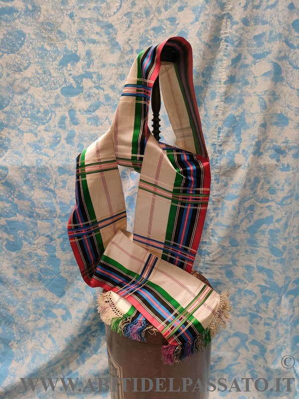 1860-1880 CIRCA, MANIFATTURA FRANCESE, STREPITOSA STOLA REALIZZATA TARTAN DI SETA POLICROMA, TERMINA ALLE ESTREMITA' CON APPLICAZIONE DI PASSAMANERIA DI FRANGE REALIZZATE MANUALMNTE, IN TONO ALLA RIGA COLORE.