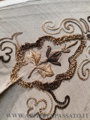1884-1886 CIRCA, MANIFATTURA ITALIANA, PROVENIENZA TOSCANA PER QUESTO OMBRELLINO REALIZZATO IN SETA, RICAMATO IN FILATO DI SETA POLICROMA CON DIVERSI TIPI DI PUNTO. MANICO IN LEGNO VERNICIATO, DECORATO DA 2 PON PON IN SETA DI COLORE BORDEAUX. FODERA IN SETA.