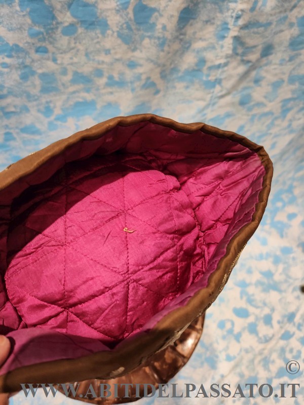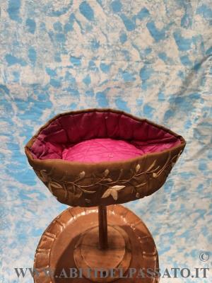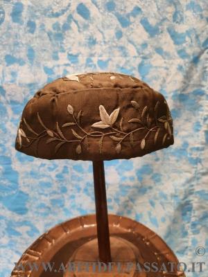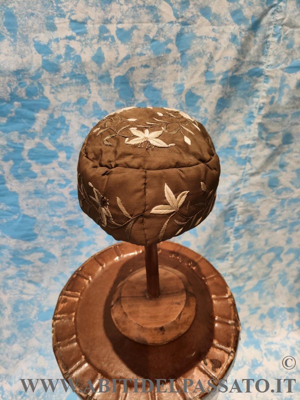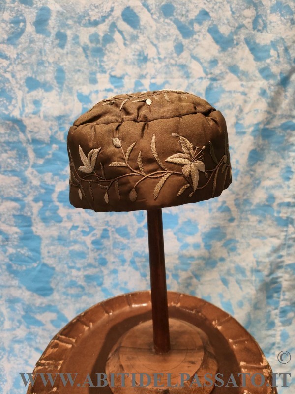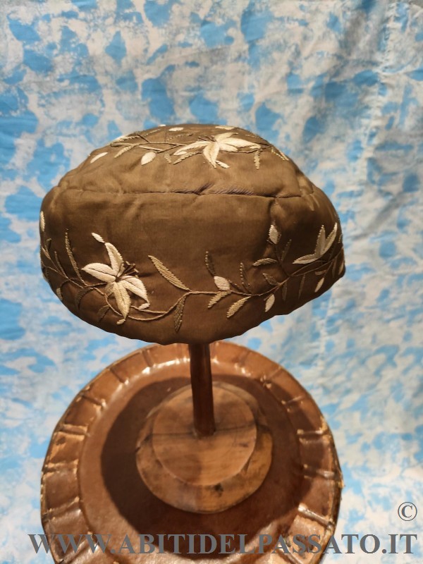 CAPPELLO MASCHILE DA FUMO REALIZZATO IN SETA DI COLOR MARRONE CHIARO, RICAMATO A MANO A MOTIVI FLOREALI, CON SETA POLICROMA IN VARI TIPI DI PUNTO.