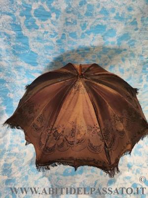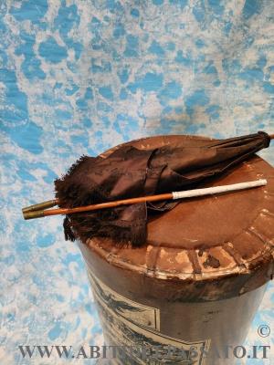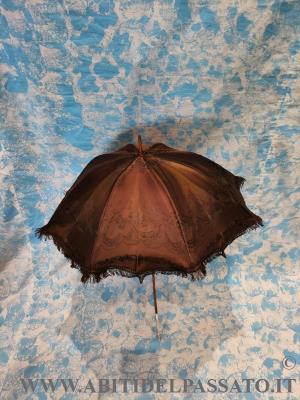 1880-1890 CIRCA, MANIFATTURA INGLESE, PROVENIENTE DALLA CITTA' DI OXFORD. OMBRELLINO DA PASSEGGIO, REALIZZATO IN SETA OPERATA DI COLORE MARRONE SCURO. FONDO DECORATO DA FRANGIA IN SETA. MANICO IN LEGNO, PIEGABILE CON IMPUGNATURA IN AVORIO.