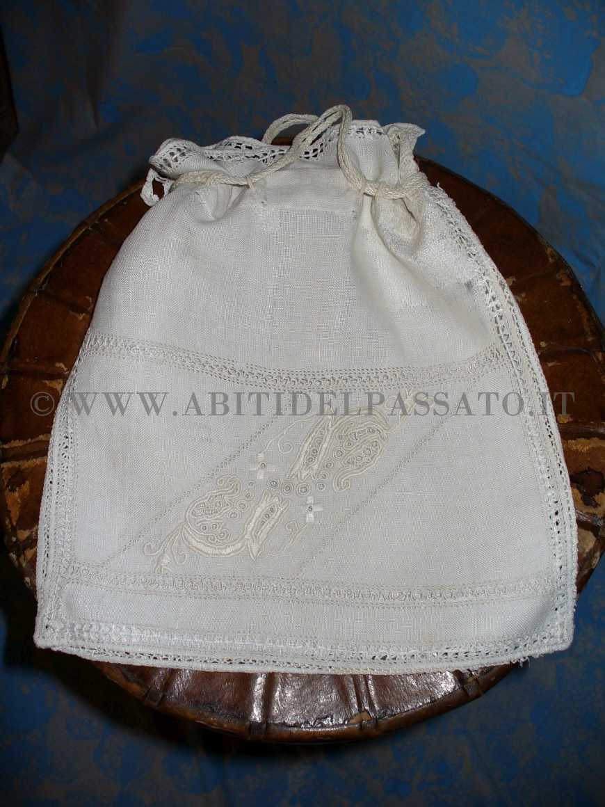 1913: BORSETTA IN TELA DI LINO RICAMATA. L'OGGETTO PROVIENE DAL GUARDAROBA PALLADIO.