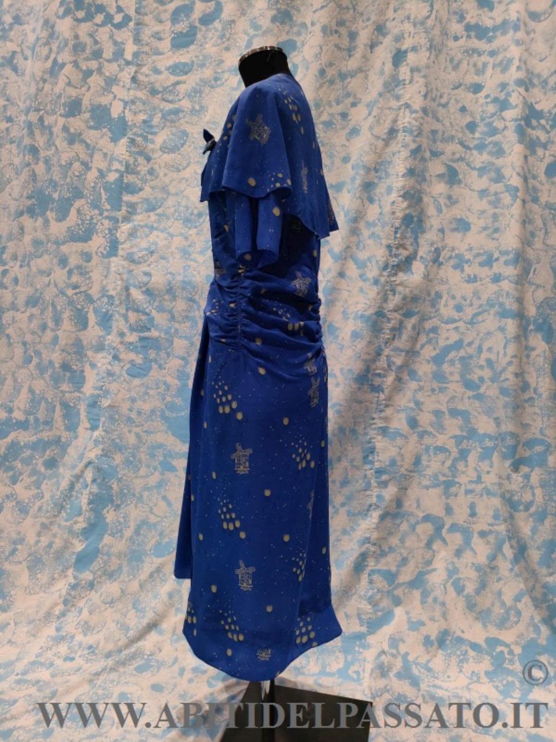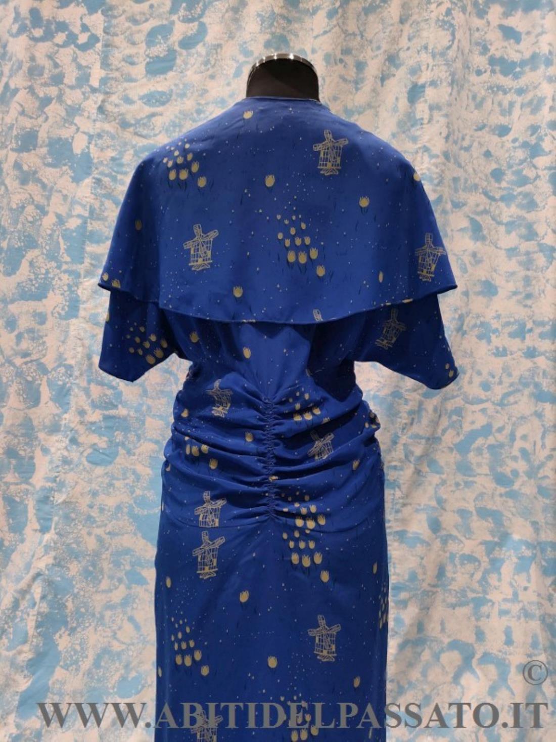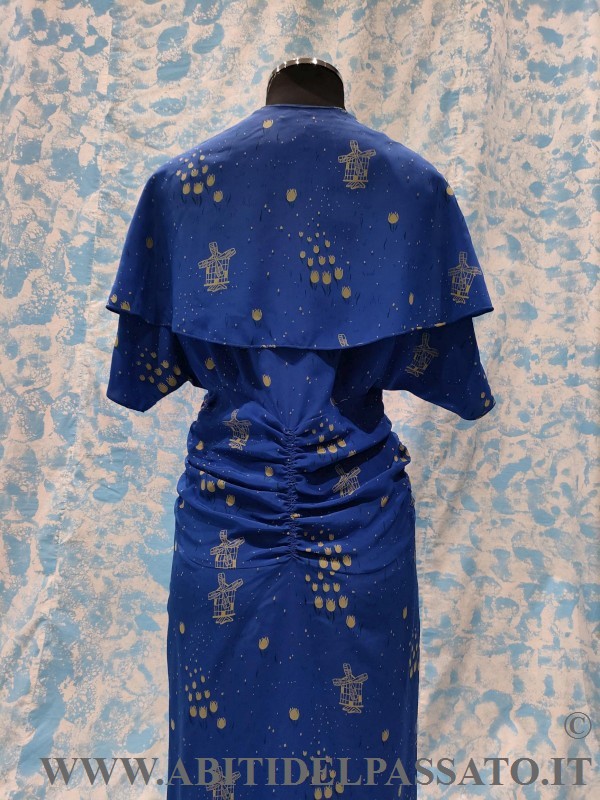 ABITO INTERO CON MANTELLINA STACCABILE, REALIZZATO IN CREPES DE CHINE, DI COLORE BLU ELETTRICO, STAMPATO A MOTIVI DI TULIPANI E MULINI A VENTO STILIZZATI