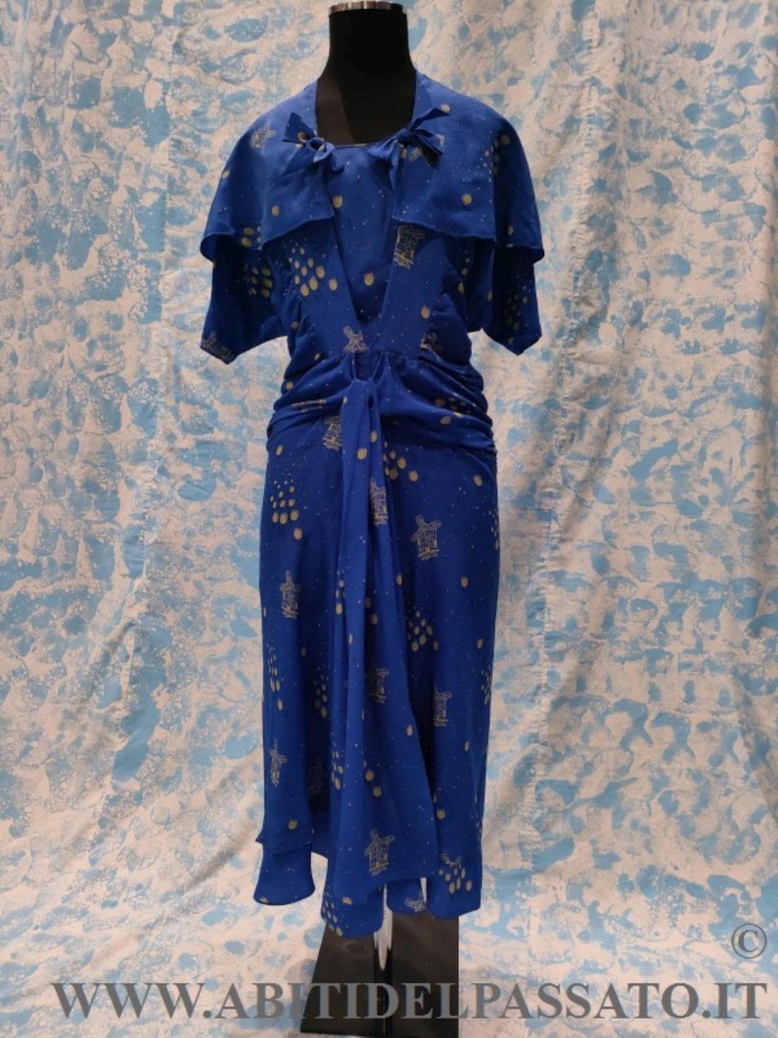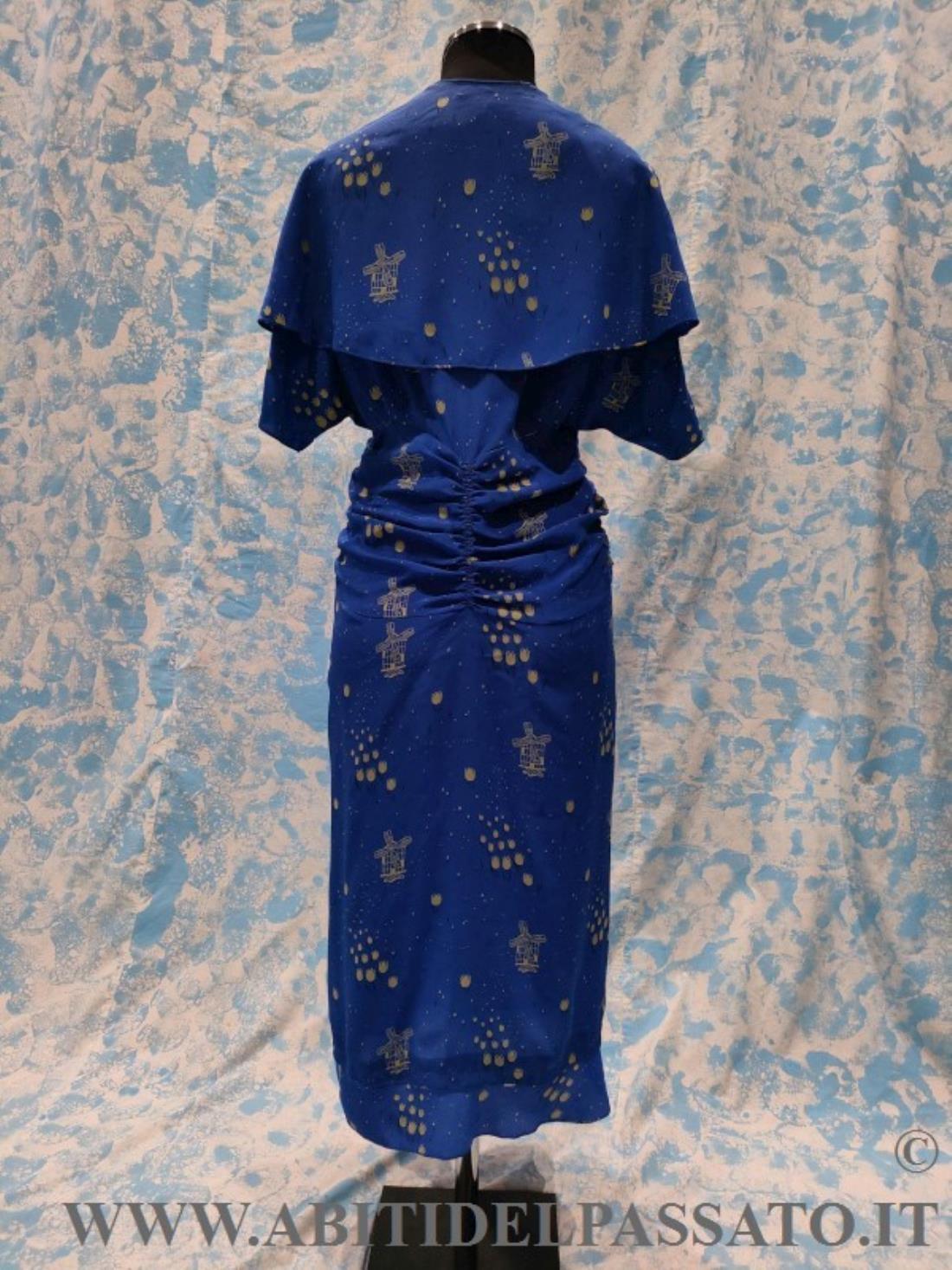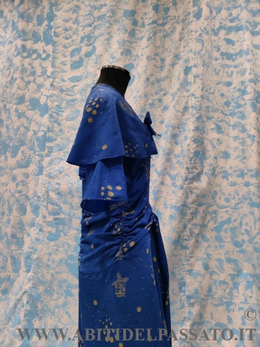 ABITO INTERO CON MANTELLINA STACCABILE, REALIZZATO IN CREPES DE CHINE, DI COLORE BLU ELETTRICO, STAMPATO A MOTIVI DI TULIPANI E MULINI A VENTO STILIZZATI