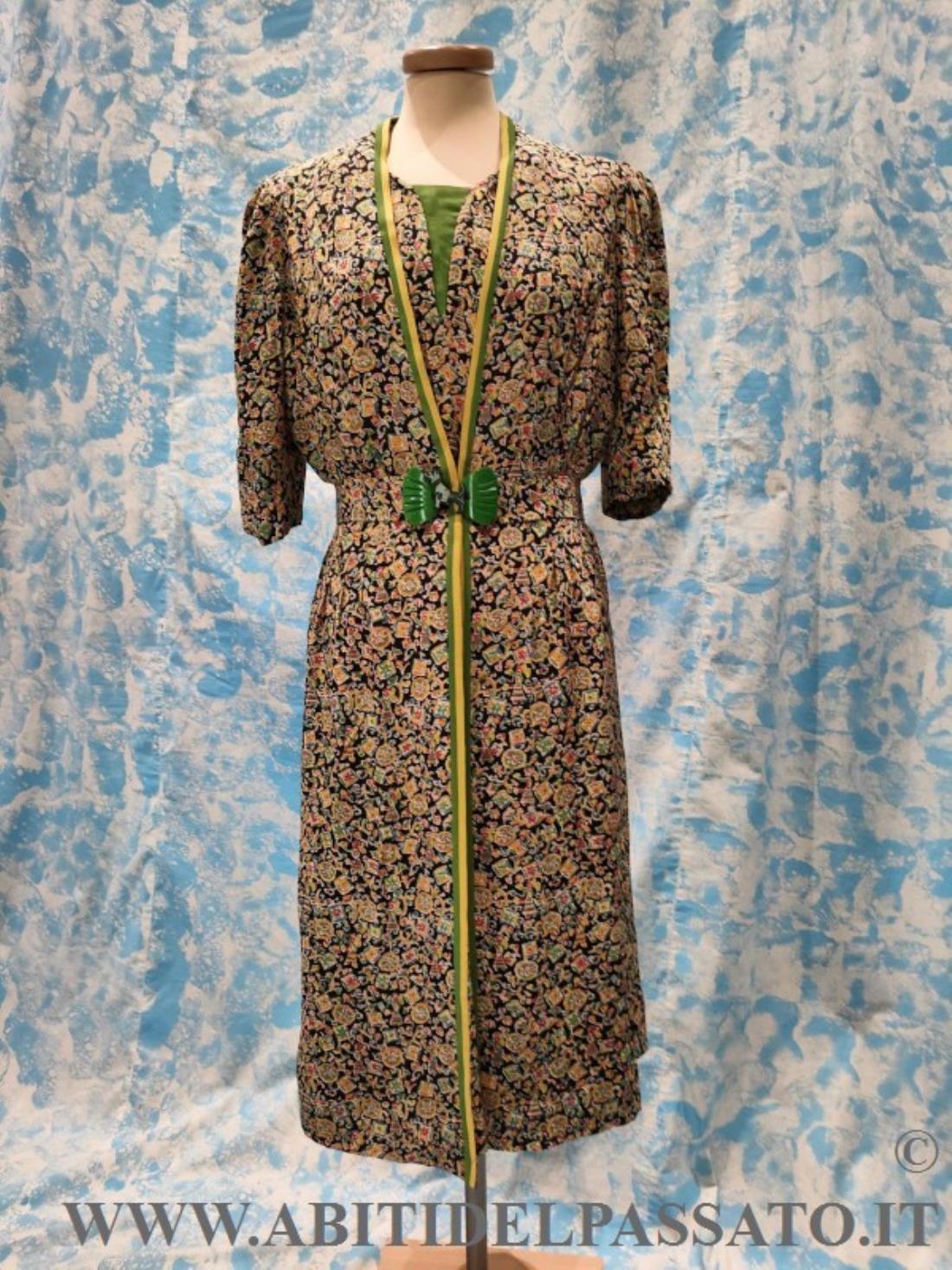 ABITO CORTO E TAGLIATO IN VITA, CON MANICA ARRICCIATA A PALLONCINO, APERTO DAVANTI MEDIANTE 4 AUTOMATICI IN PROSSIMITA' DEL TASSELLO VERDE, NON HA ALTRE APERTURE, IL TELO DEL DAVANTI DELLA GONNA, PRESENTA UN PLISSE' A PIEGA PIATTA, CON PIEGHE SPECCHIATE. PURTROPPO LA FANTASIA DEL TESSUTO, NON PERMETTE DI CAPIRE BENE I TAGLI E LE MOLTE LAVORAZIONI PRESENTI NELL'ABITO. SOPRABITO A MANICA TRE QUARTI, SI CHIUDE NEL CENTRO DAVANTI MEDIANTE 2 BOTTONI INTERNI, BOLERINO SENZA CHIUSURA E A COMPLETARE IL TUTTO, UNA CINTURA CON PARTICOLARE FIBBIA IN BACHELITE.