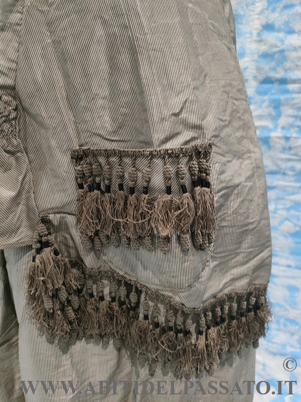 GONNA A CLOCHE, LISCIA E ADERENTE SUL DAVANTI E' ORLATA FRONTALMENTE AL FONDO DA VOLANO PLISSETTATO E SUL DIETRO DA UNO ARRICCIATO. IL VOLUME MASSIMO DELLA GONNA,E' CONENTRATO NEL PANNELLO POSTERIORE CHE RISULTA ESSERE DRAPPEGGIATO. PASSAMANERIA DI SETA A FRANGIE, DECORA LA GIACCA IN VARI PUNTI.