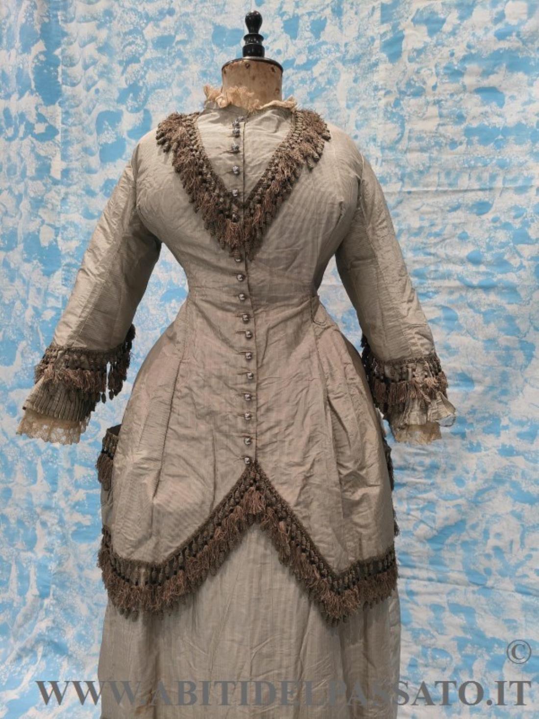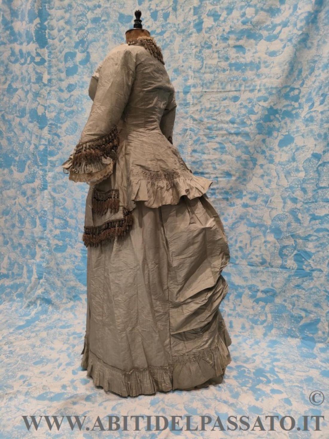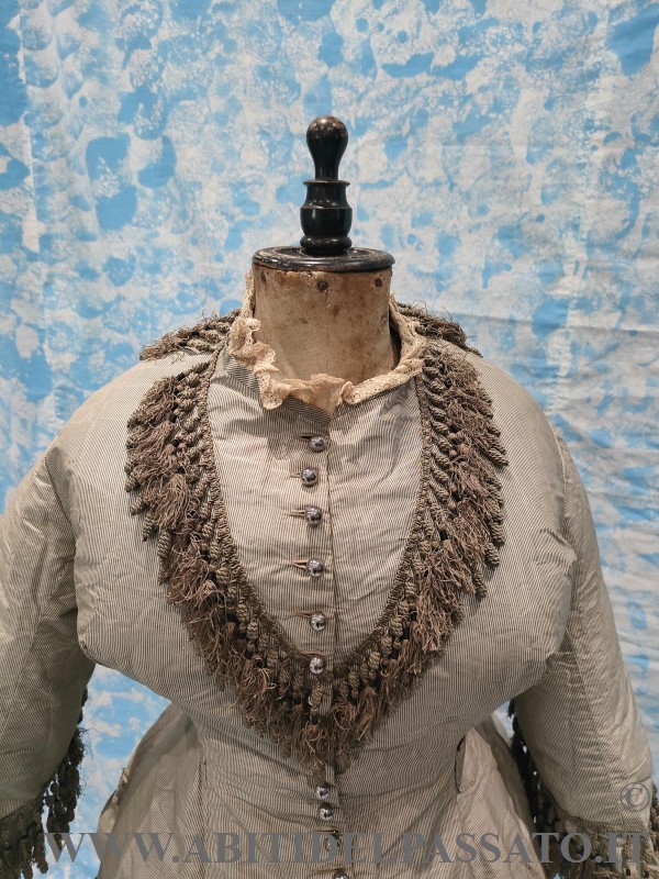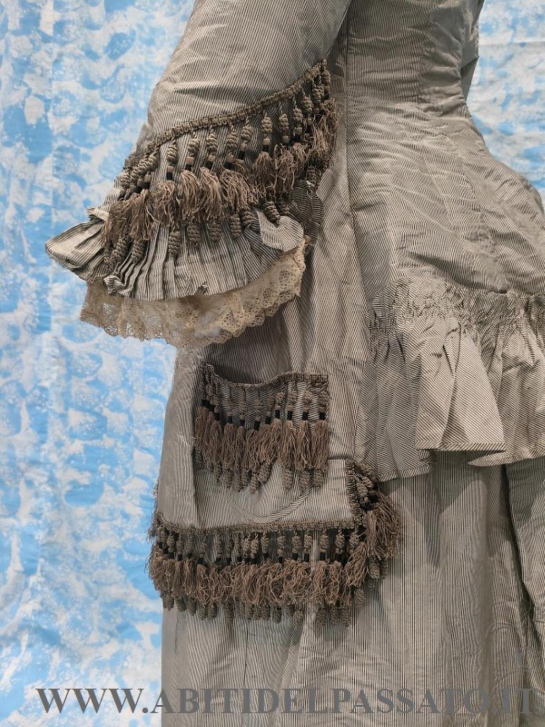 1876-78 CIRCA, MANIFATTURA ITALIANA PER QUESTO ABITO COMPOSTO DA GIACCA E GONNA E REALIZZATO IN SETA MILLE RIGHE NEI TONI DEL GRIGIO CHIARO E COLOR MARRONE.