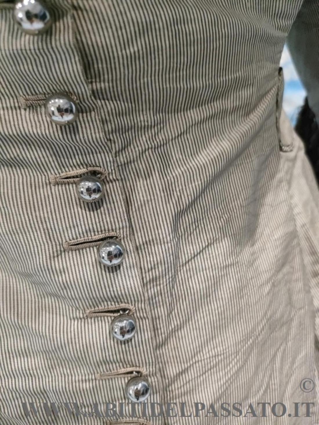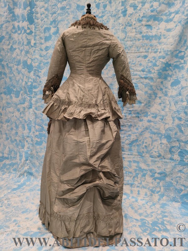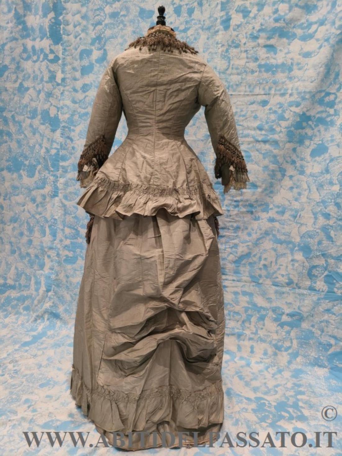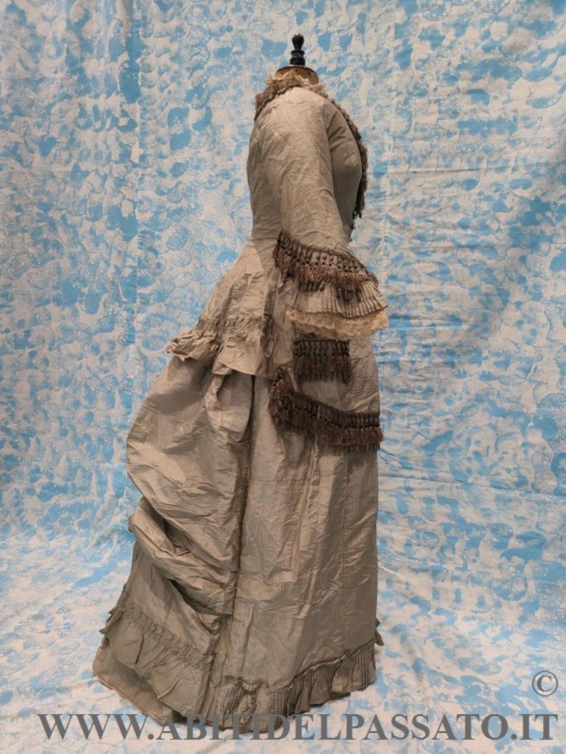 1876-78 CIRCA, MANIFATTURA ITALIANA PER QUESTO ABITO COMPOSTO DA GIACCA E GONNA E REALIZZATO IN SETA MILLE RIGHE NEI TONI DEL GRIGIO CHIARO E COLOR MARRONE.