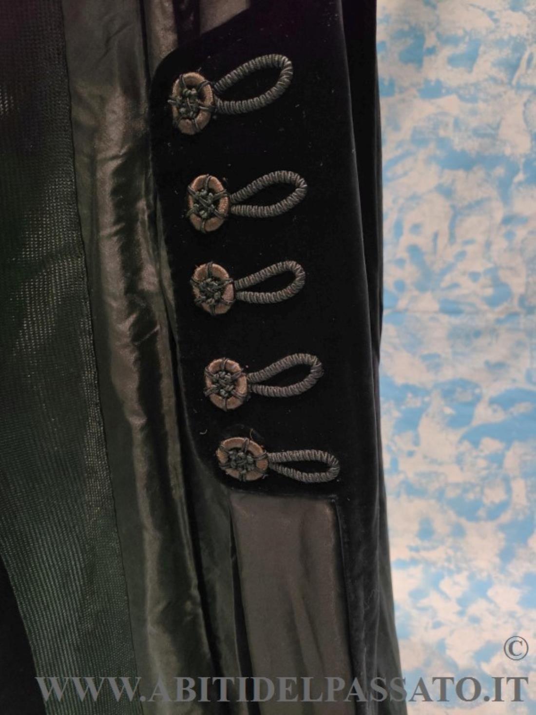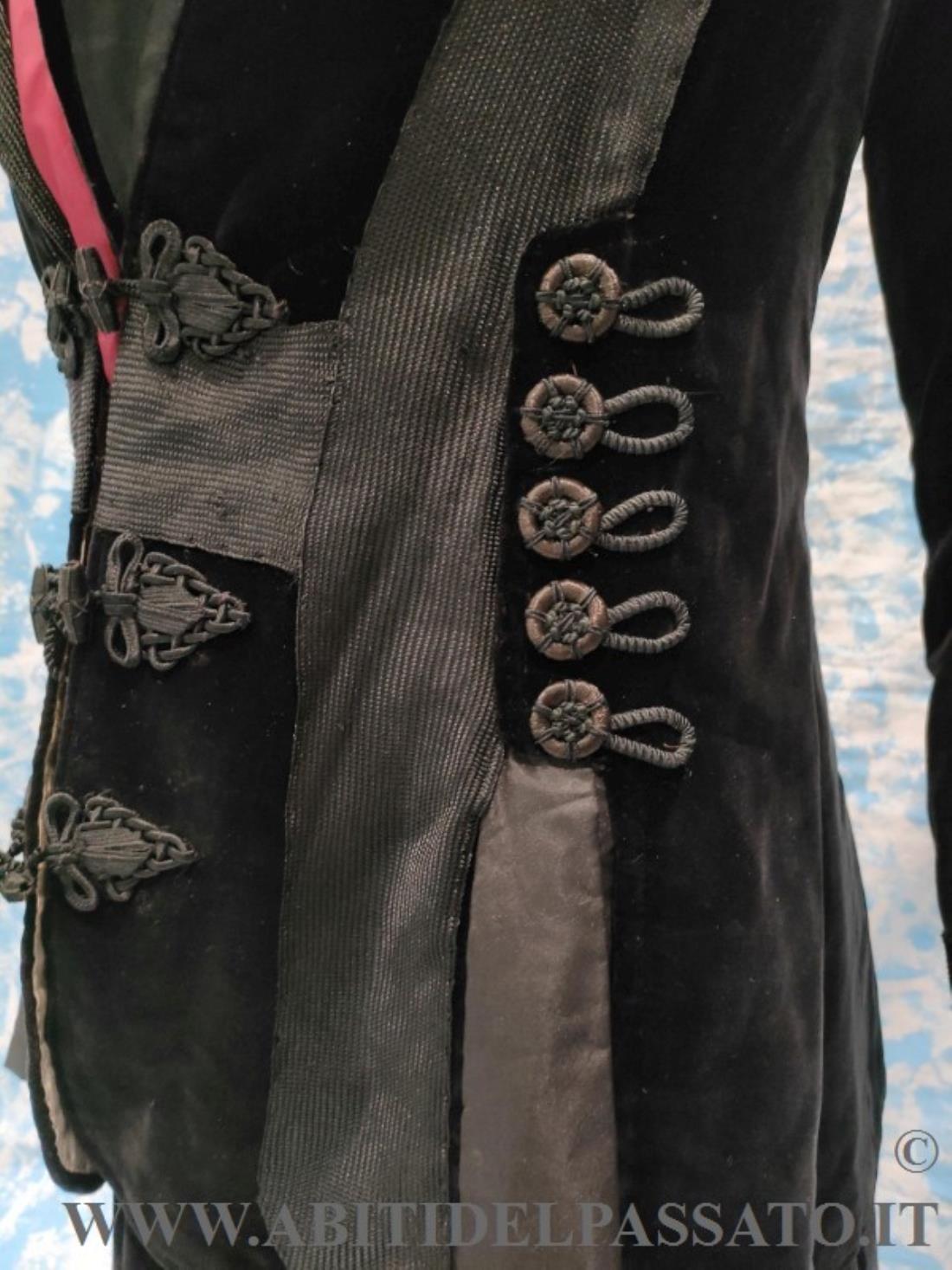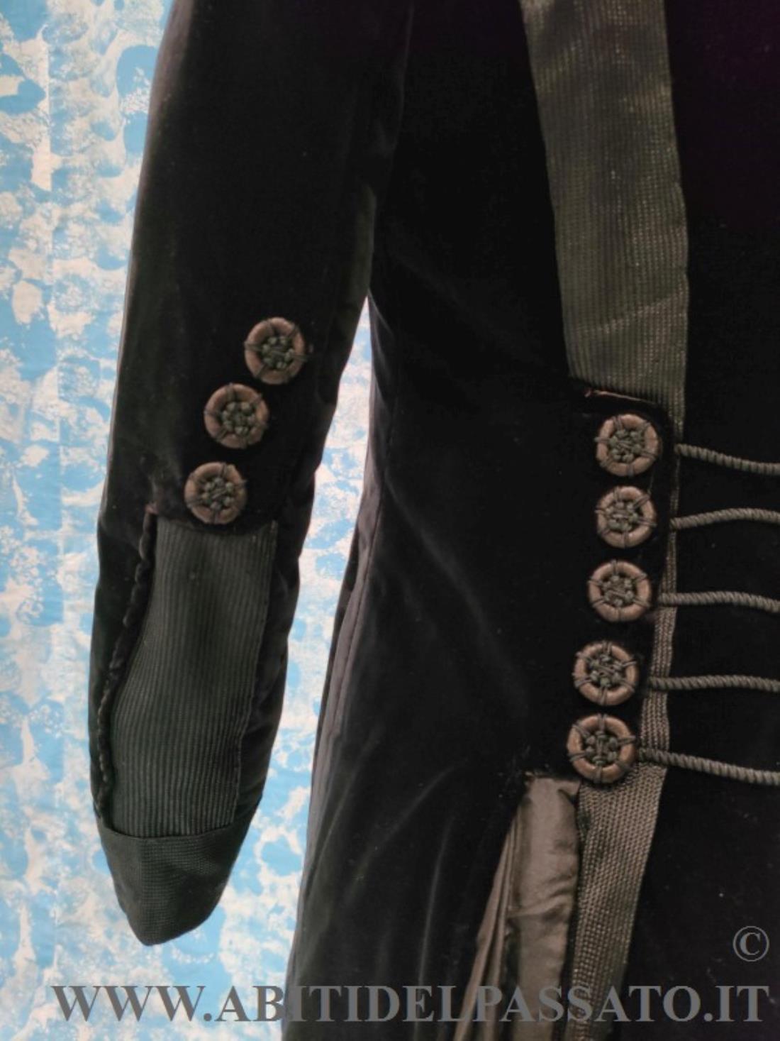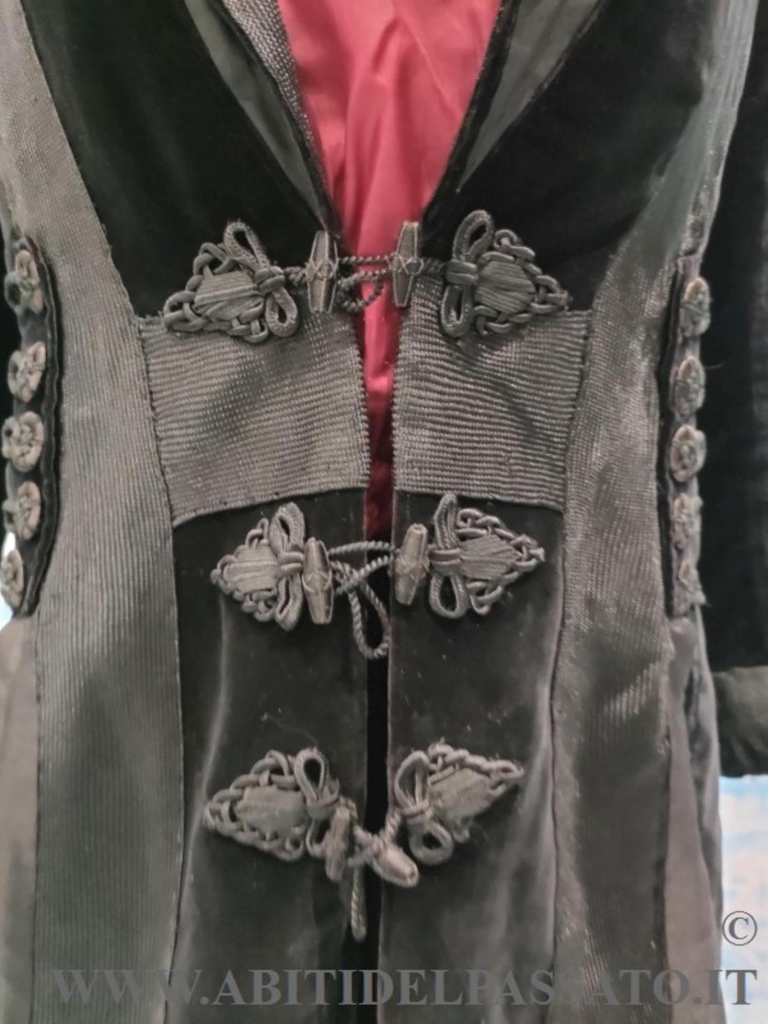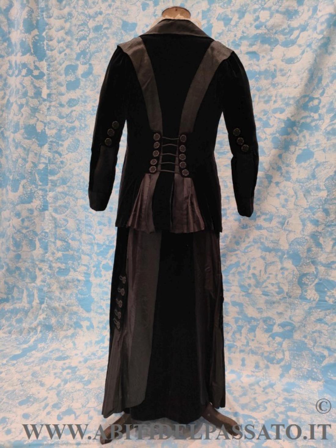 1912-1915, MANIFATTURA ITALIANA PER QUESTO COMPLETO DA GIORNO O DA LUTTO, COMPOSTO DA GIACCA E GONNA, REAIZZATO IN VELLUTO E RASO DI SETA DI COLORE NERO, DECORATO DA PASSAMANERIA, ALAMARI E BOTTONI RICAMATI, CORDONCINO E SOUTACHE DI SETA.