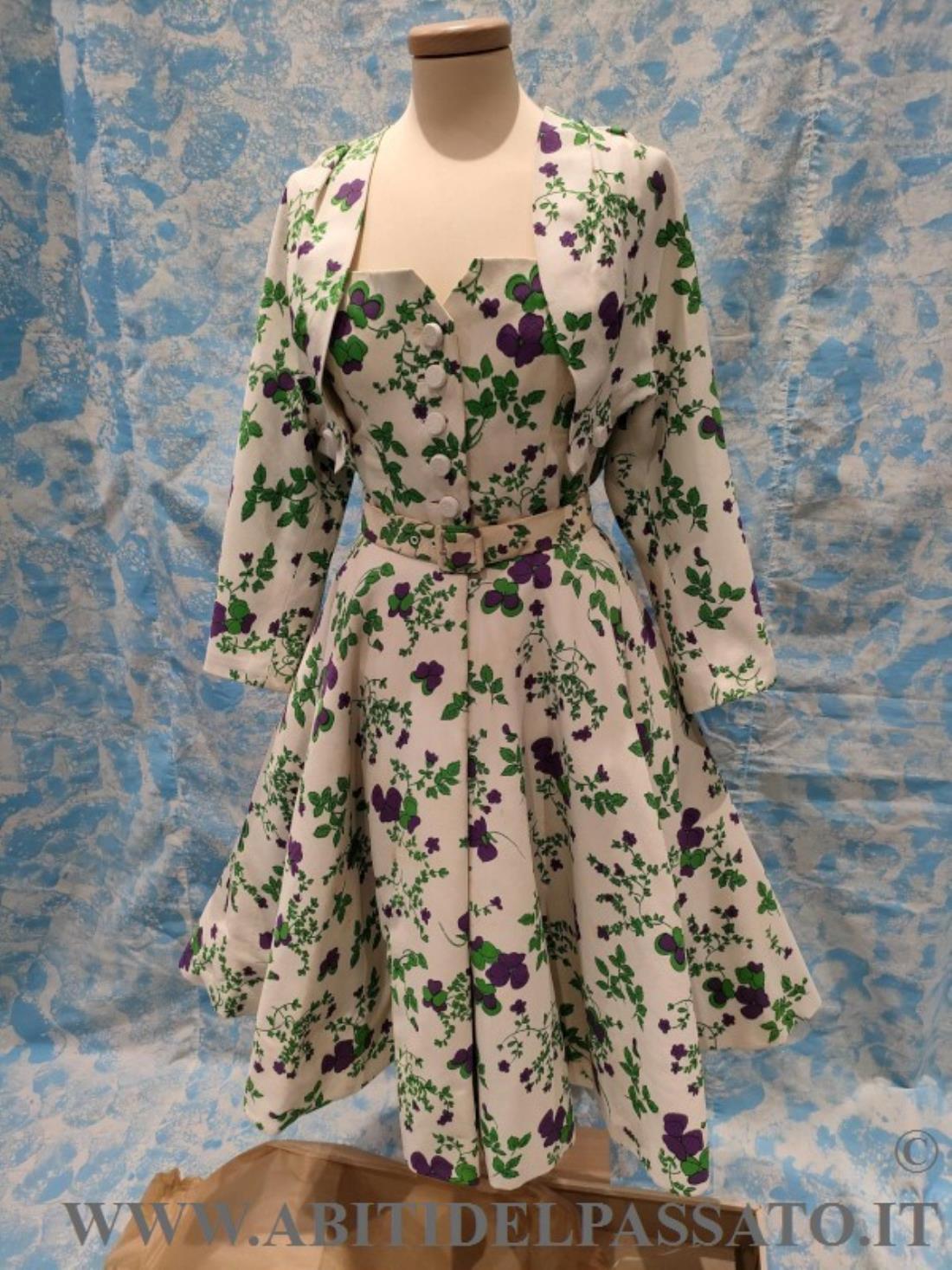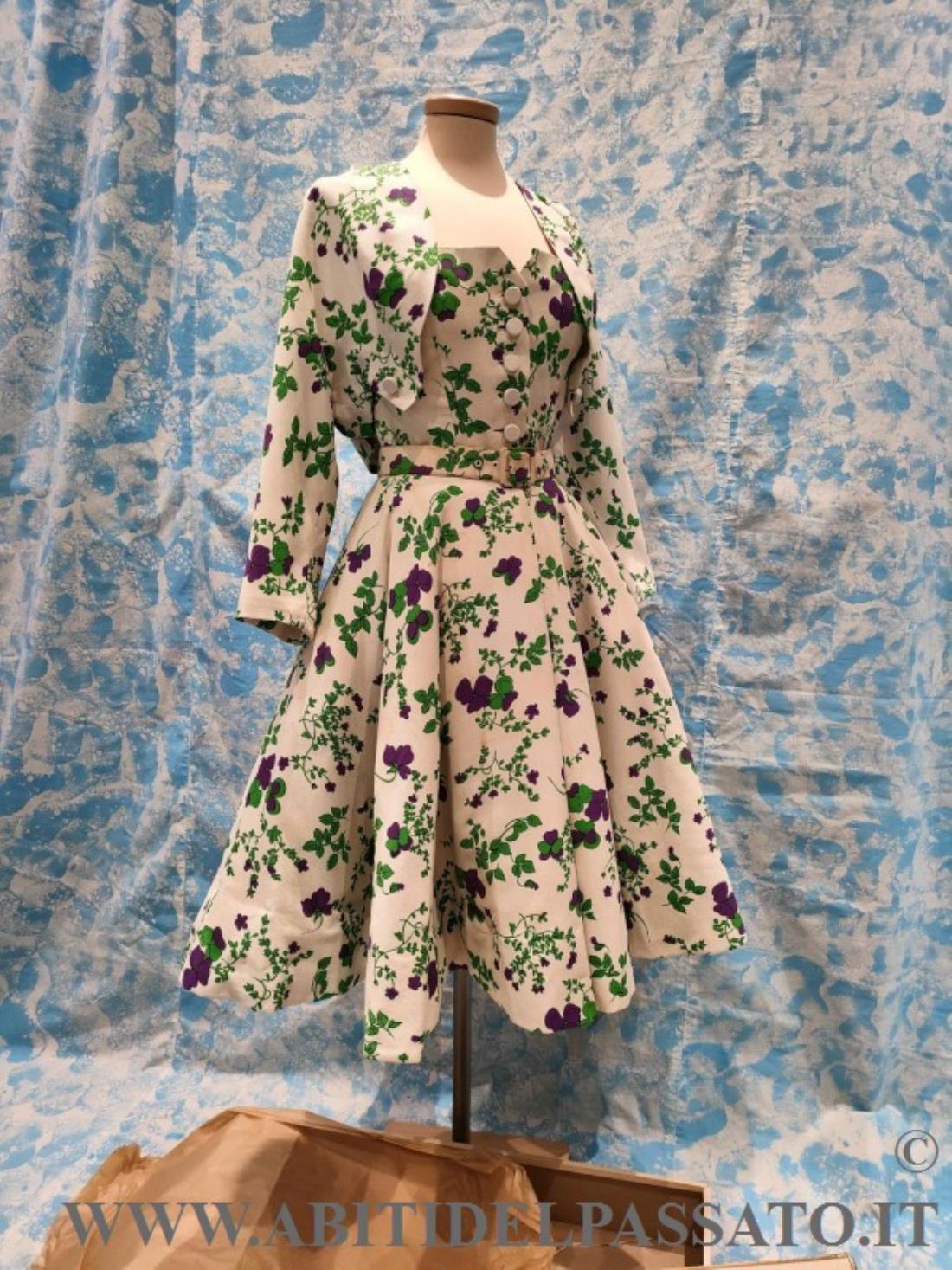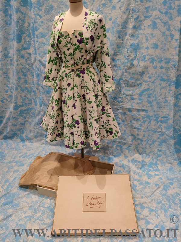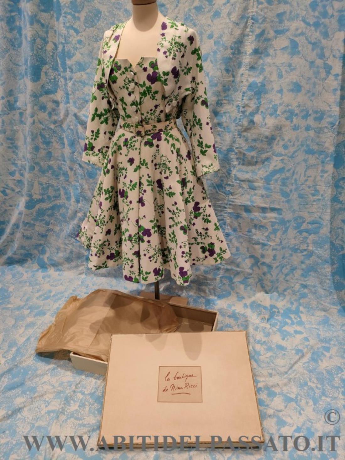 RARO ABITO DA COCKTAIL FIRMATO DALLA GRIFFE DI NINA RICCI, COMPOSTO DA ABITO INTERO, BOLERINO, CINTURA, SOTTOGONNA E COMPLETATO DALLA SUA SCATOLA DI CARTONE E VELINE, ORIGINALI.