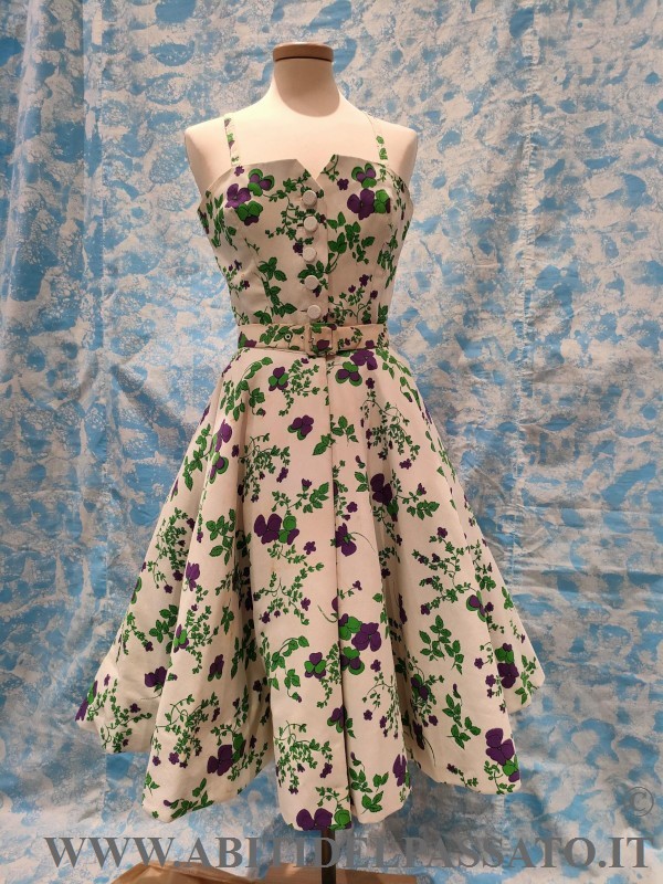 L'ABITO PRESENTA IL CORPINO STECCATO ED E' CHIUSO FRONTALMENTE DA BOTTONI E GANCI, GONNA A RUOTA INTERA FODERATA DI CELLULOSA. IL BOLERINO SI ANCORA ALL'ABITO MEDIANTE GANCI E OCCHIELLI IN FILO, SOTTOGONNA SEPARATA, REALIZZATA IN CRINOLINA E SI CHIUDE CON GANCI. CINURA SAGOMATA, REALIZZATA NELLO STESSO TESSUTO E RINFORZATA DA UNO STRATO DI TELA, CARTONE E RIFINITA CON PELLE DI CAPRETTO SOTTILISSIMO.