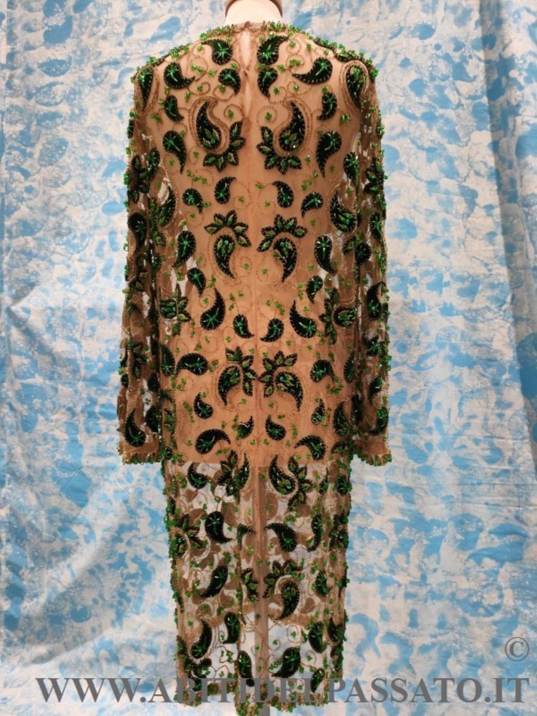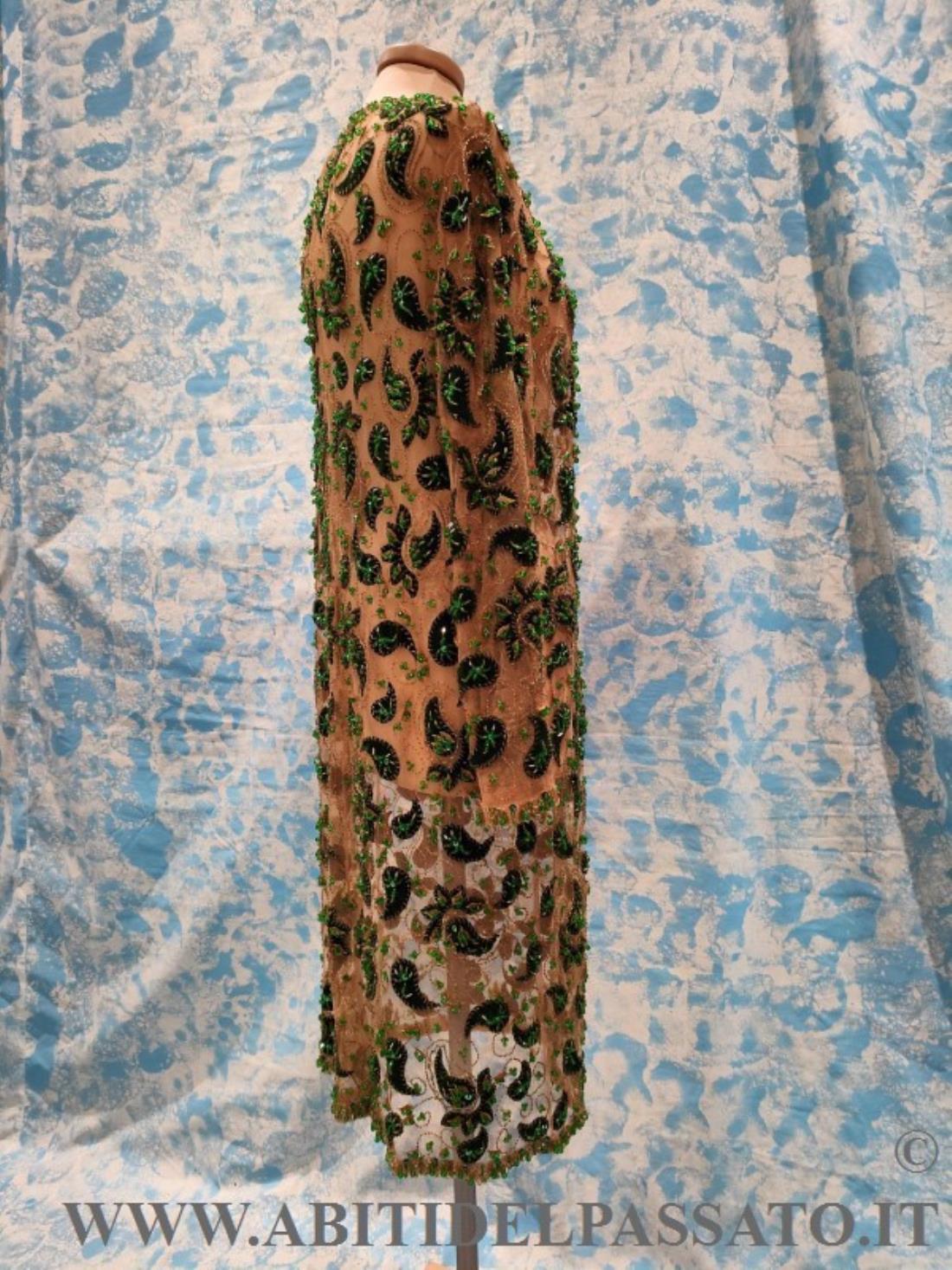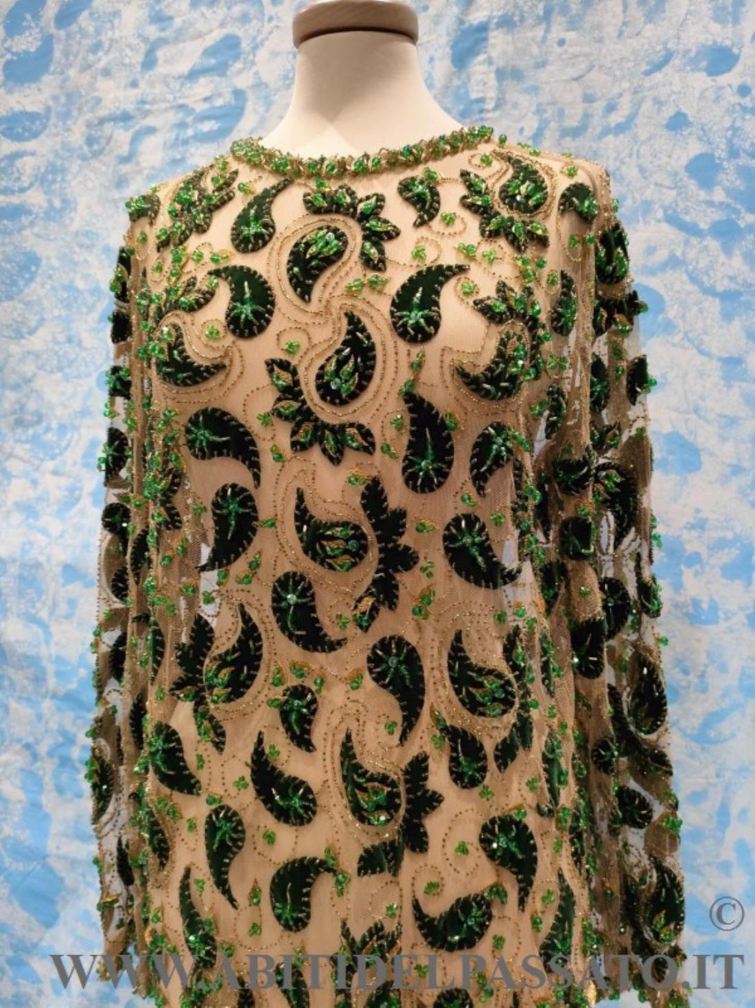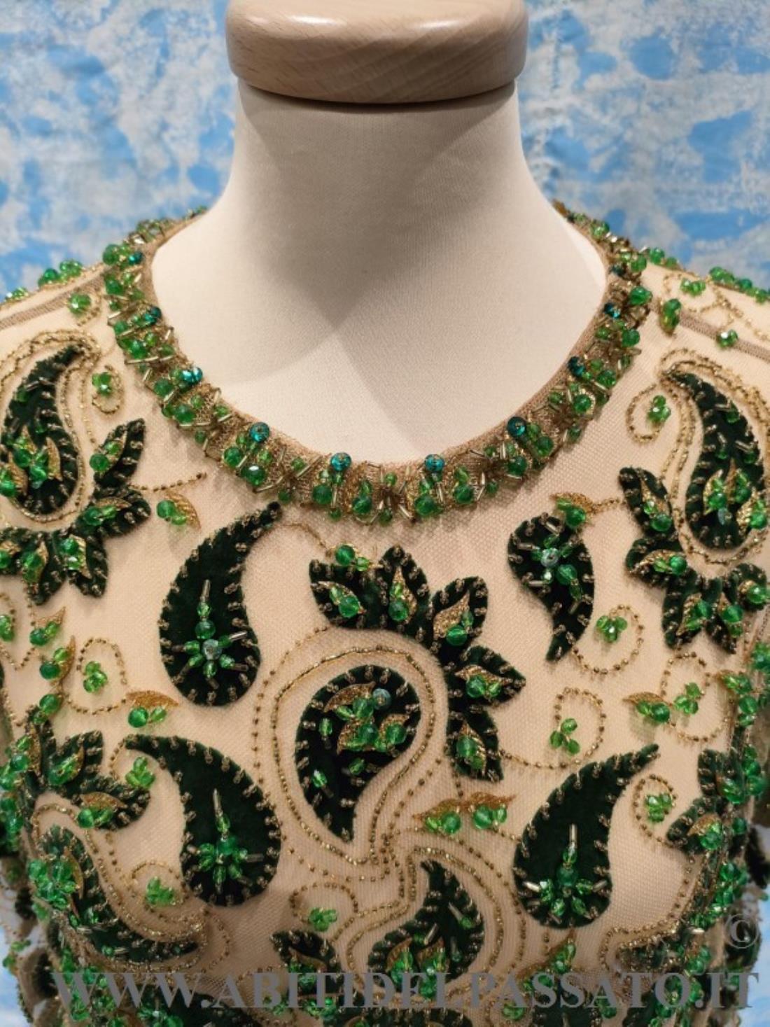 1960-65 CIRCA, ABITO DA COCKTAIL REALIZZATO IN TULLE DI COTONE E RICAMATO A PATCH DI VELLUTO, CONTERIE, ELEMENTI PLASTICI E VITREI, RELIZZATI NEI TONI DEL VERDE SMERALDO E ORO.