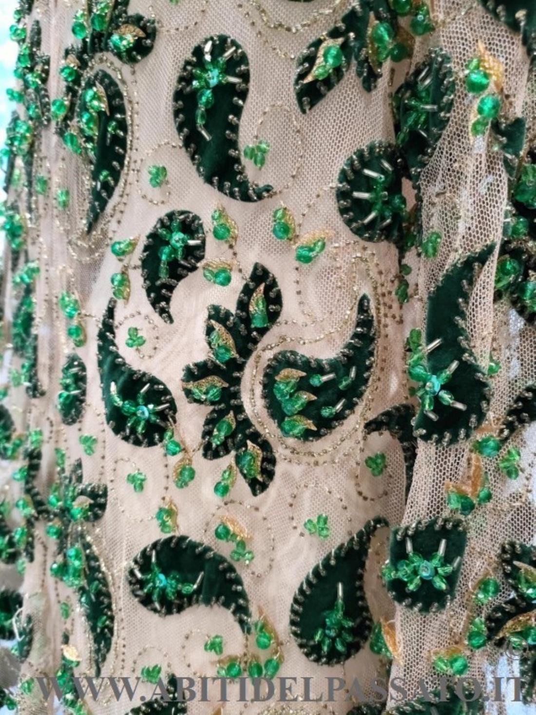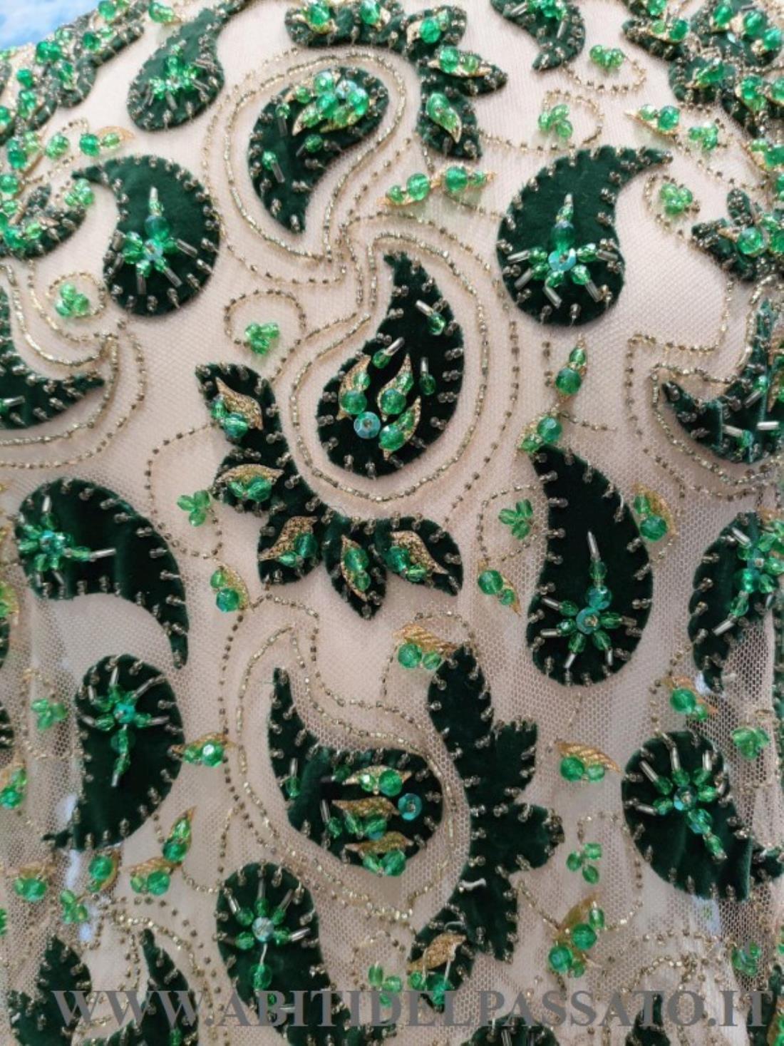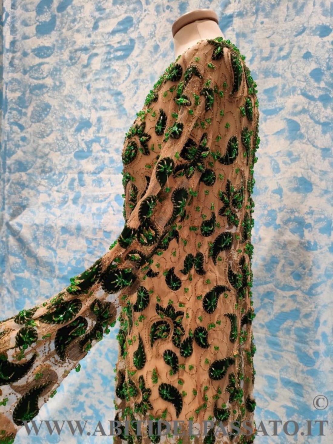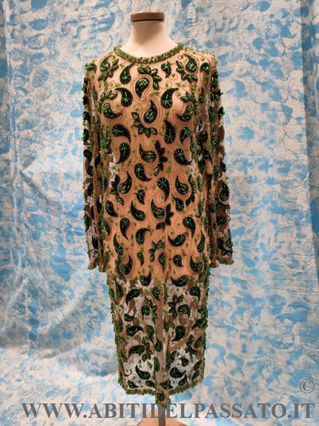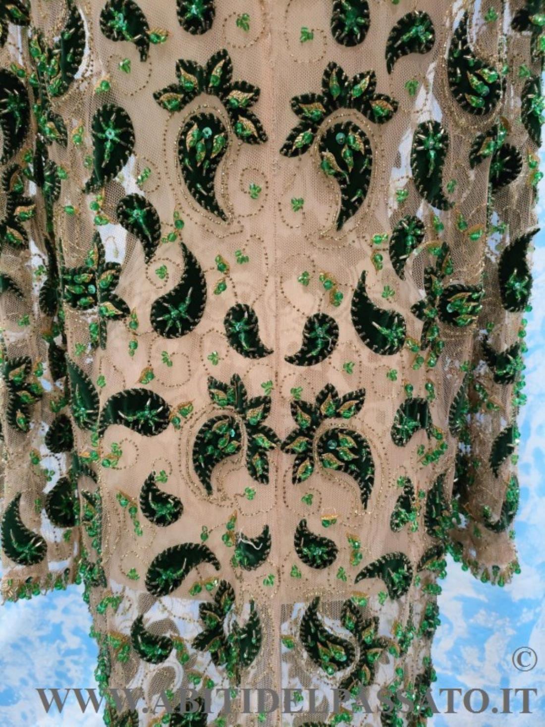 1960-65 CIRCA, ABITO DA COCKTAIL REALIZZATO IN TULLE DI COTONE E RICAMATO A PATCH DI VELLUTO, CONTERIE, ELEMENTI PLASTICI E VITREI, RELIZZATI NEI TONI DEL VERDE SMERALDO E ORO.