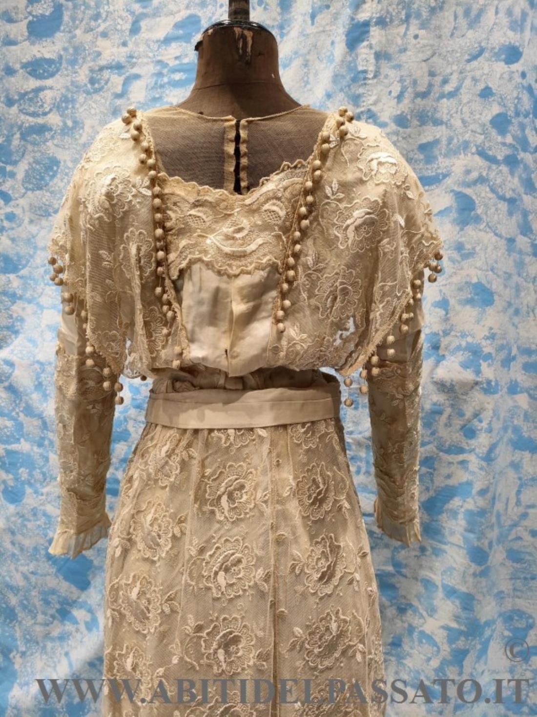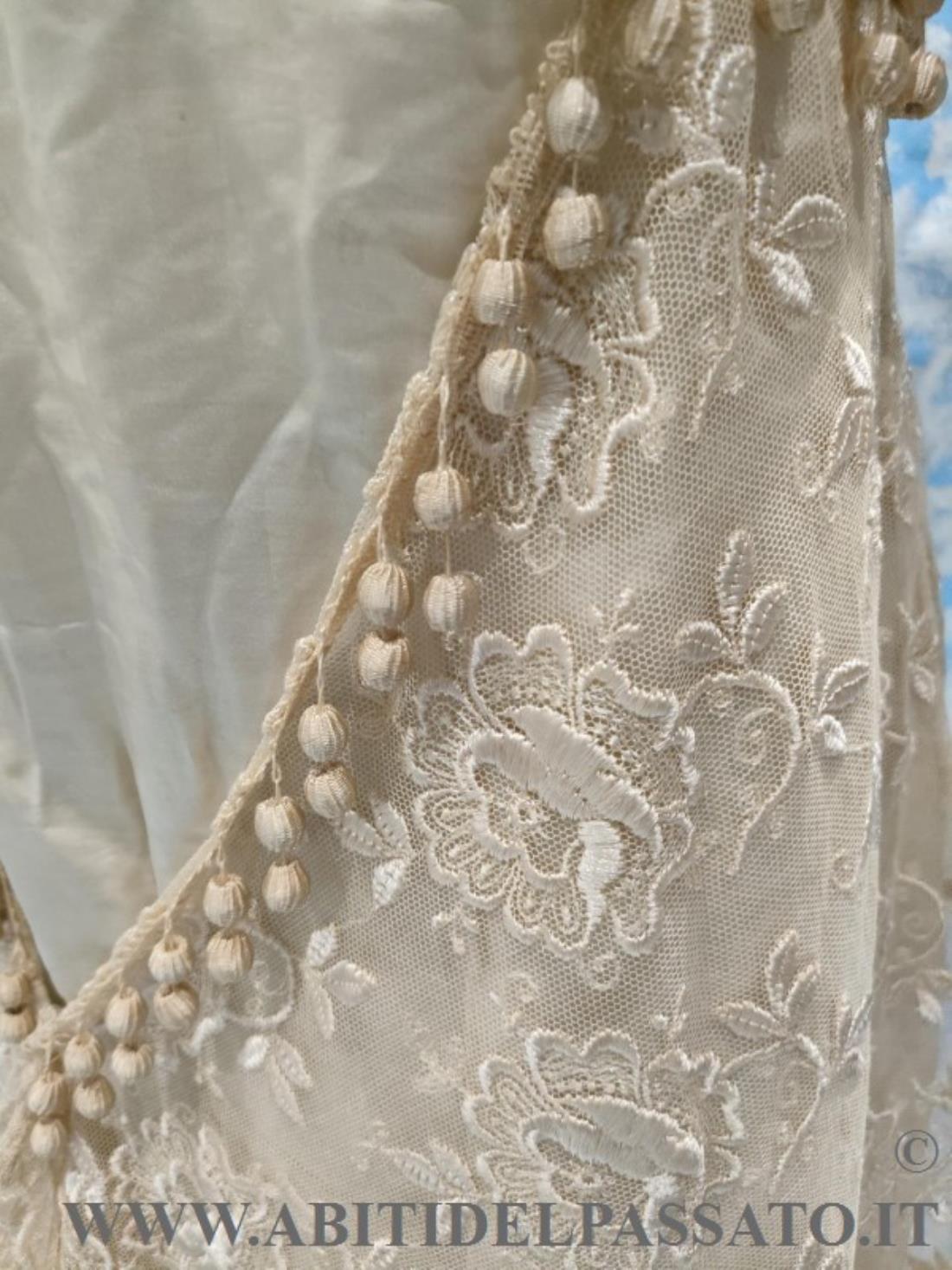 RAFFINATO ABITO DA SPOSA, COMPOSTO DA CORPINO E GONNA, REALIZZATA IN RASO DI SETA, MERLETTO MECCANICO A DISEGNO FLOREALE, TULLE DI COTONE E ARRICCHITO DA PASSAMANERIA IN SETA CON PENDENTI RIVESTITI IN FILO DI SETA, TUTTO NEL COLORE AVORIO.