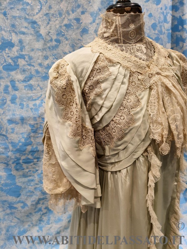 ELEGANTE ABITO INTERO DA CAMERA, REALIZZATO IN CREPES DE CHINE DI COLORE VERDE MENTA, ARRICCHITO DA MERLETTO MECCANICO, TULLE DI COTONE E FODERE IN PURO LINO DI COLORE AVORIO.
