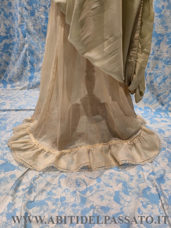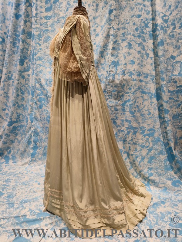 L'ABITO APPARTENNE A DONNA GIUSEPPINA BADALA', SPOSATA IN FIAMINGO, NATA AD ACIREALE IL 27 GENNAIO DEl 1882 E SPOSATATI NELLA STESSA CITTA' NEl 1908. L'ABITO FACENTE PARTE DEL CORREDO, E'PERVENUTO GRAZIE ALLA DONAZIONE DI UNA DIRETTA PARENTE.