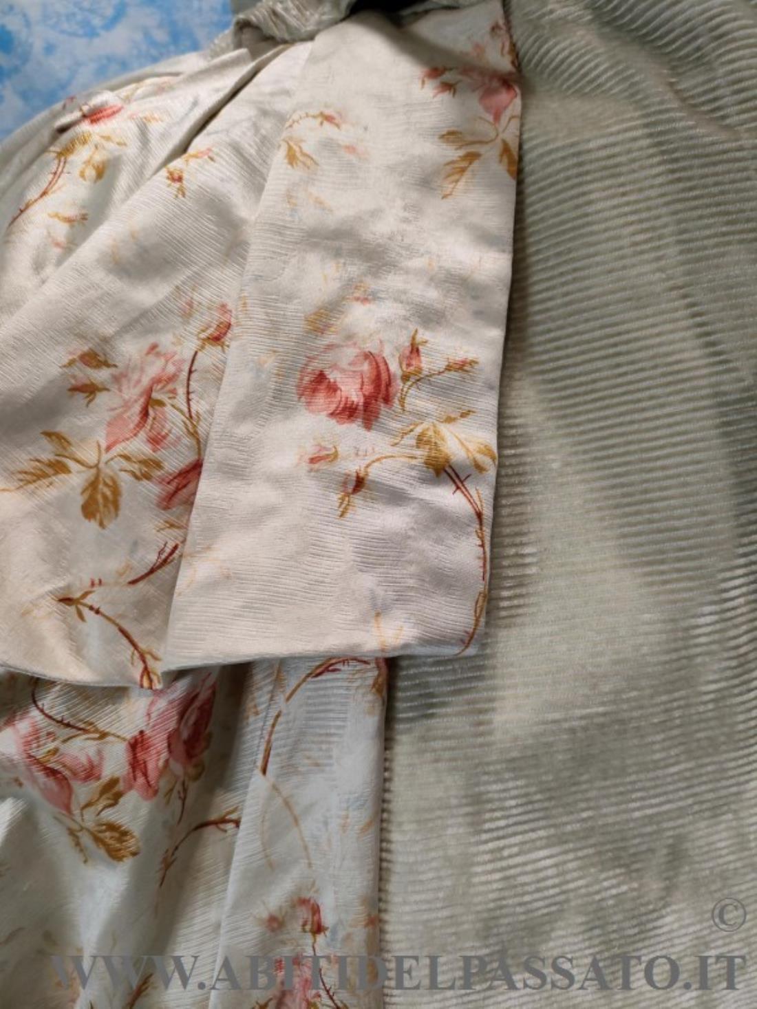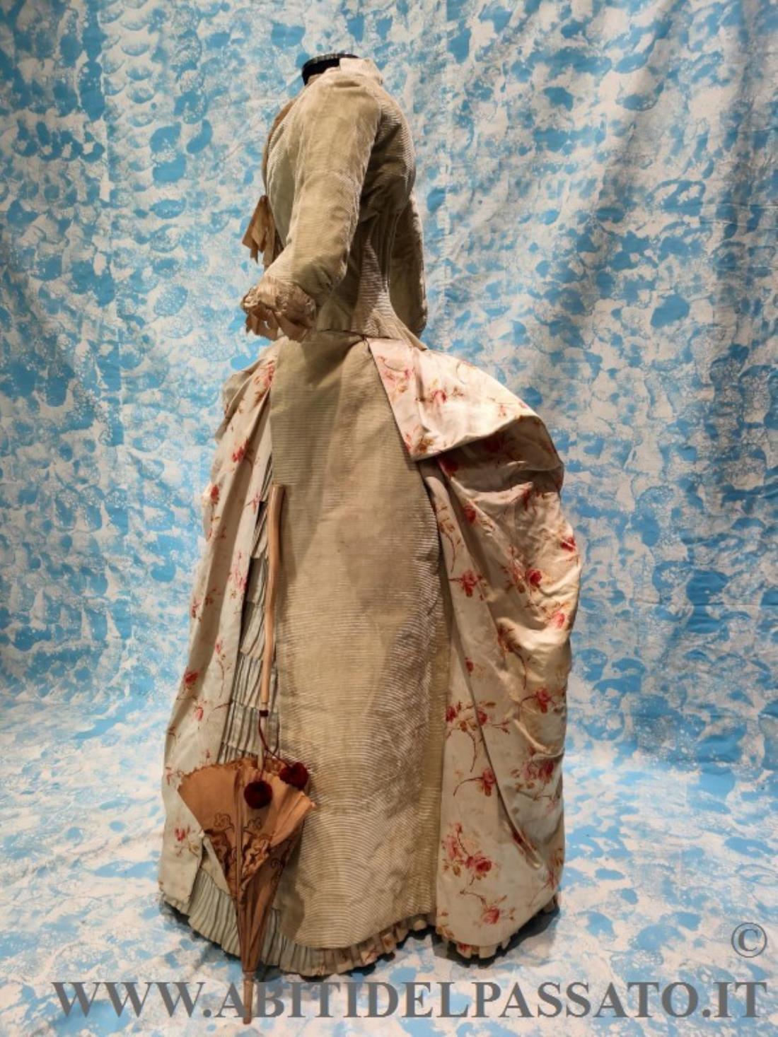 ABITO DA PASSEGGIO COMPOSTO DA CORPINO E GONNA E REALIZZATO CANNELLATO DI SETA COLOR GRIGIO CHIARO, SETA STAMPATA A MOTIVI FLOREALI CON FONDO IN TONO ALL'ABITO, PIZZO, RASO DI SETA, NASTRI IN SETA.