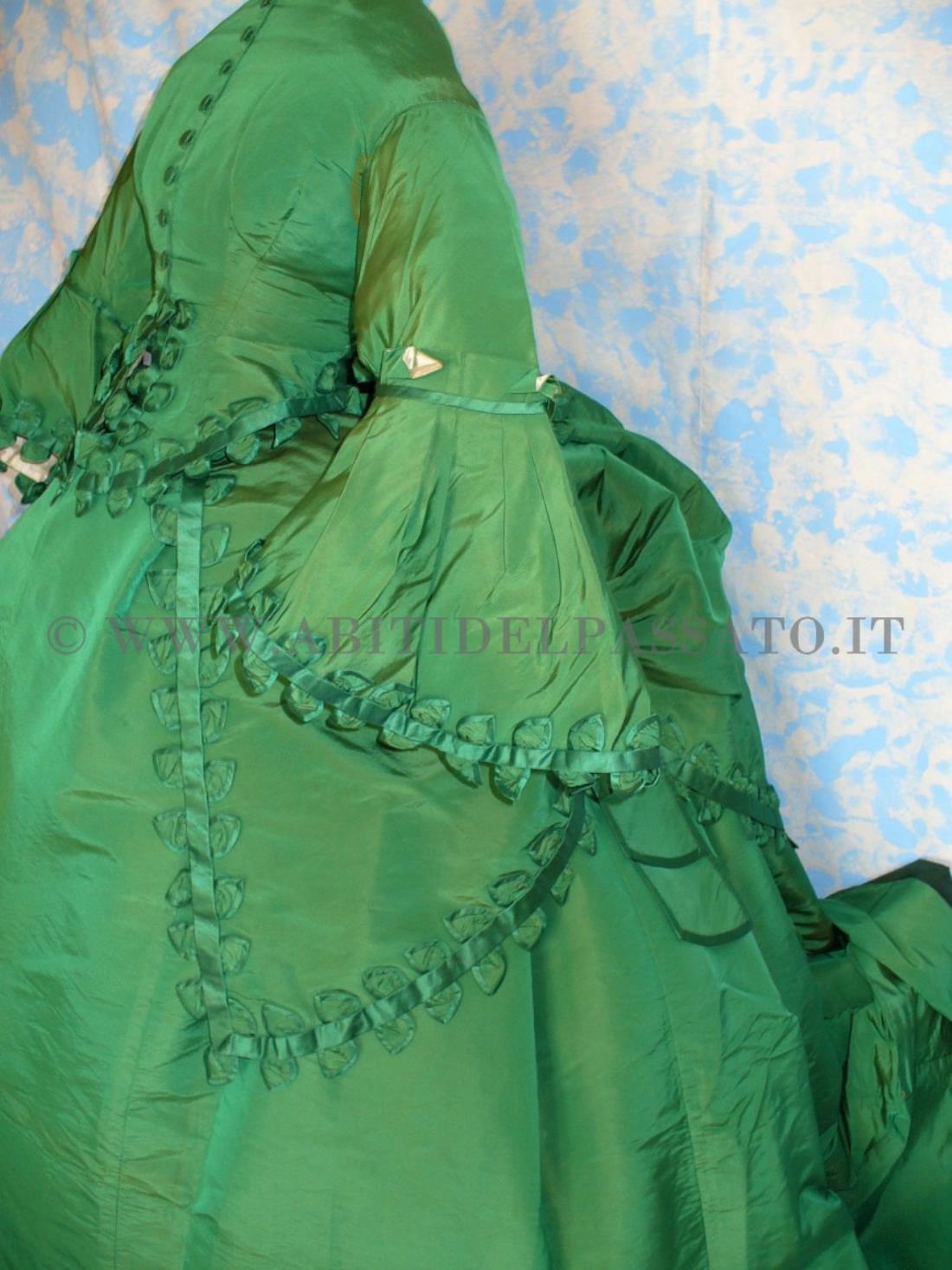 1865: ABITO COMPOSTO DA GONNA TABLIER E GIACCA, REALIZZATO IN TAFFETAS DI SETA E RASO DI SETA VERDE SMERALDO.